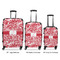The smallest suitcase is perfect for a carry on (of course, check your airline's dimensions to be sure) while the medium and large suitcases are great as checked bags. The suitcase has 3 different handles. One on the top and the side, each for carrying off the ground. The third is a pop up handle for wheeling your suitcase around on its 4 swivel wheels. Each suitcases size and weight are below: