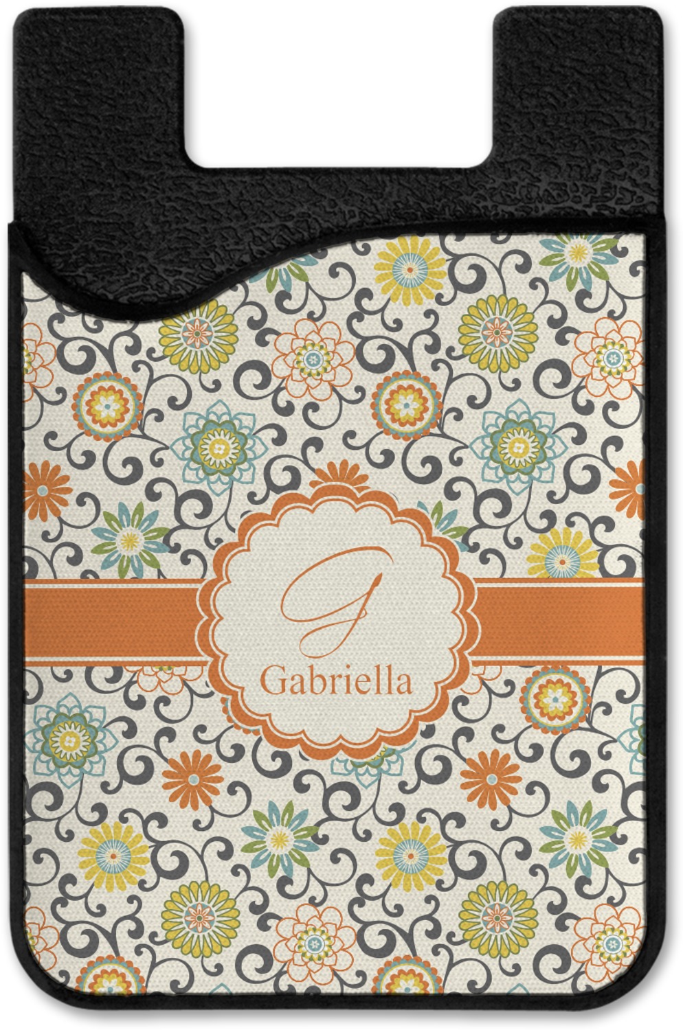 In this floral design the flowers of orange, green, blue, and yellow are connected with swirls of dark gray. The design has a classic ribbon in orange trimmed in off white. The decorative off white scalloped label is trimmed in orange. Add an initial and a name for that personal touch to pull the entire design together.