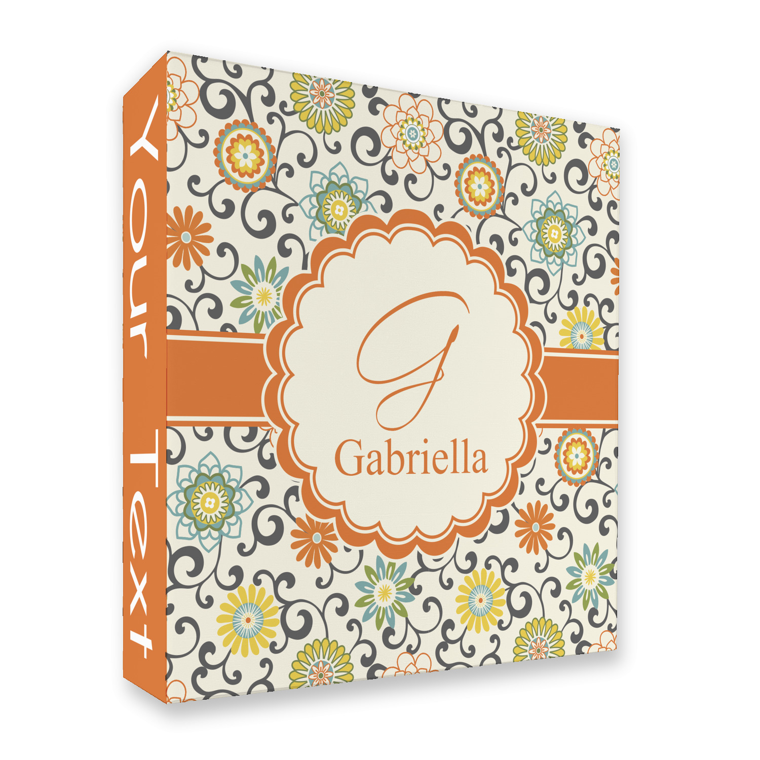 In this floral design the flowers of orange, green, blue, and yellow are connected with swirls of dark gray. The design has a classic ribbon in orange trimmed in off white. The decorative off white scalloped label is trimmed in orange. Add an initial and a name for that personal touch to pull the entire design together.