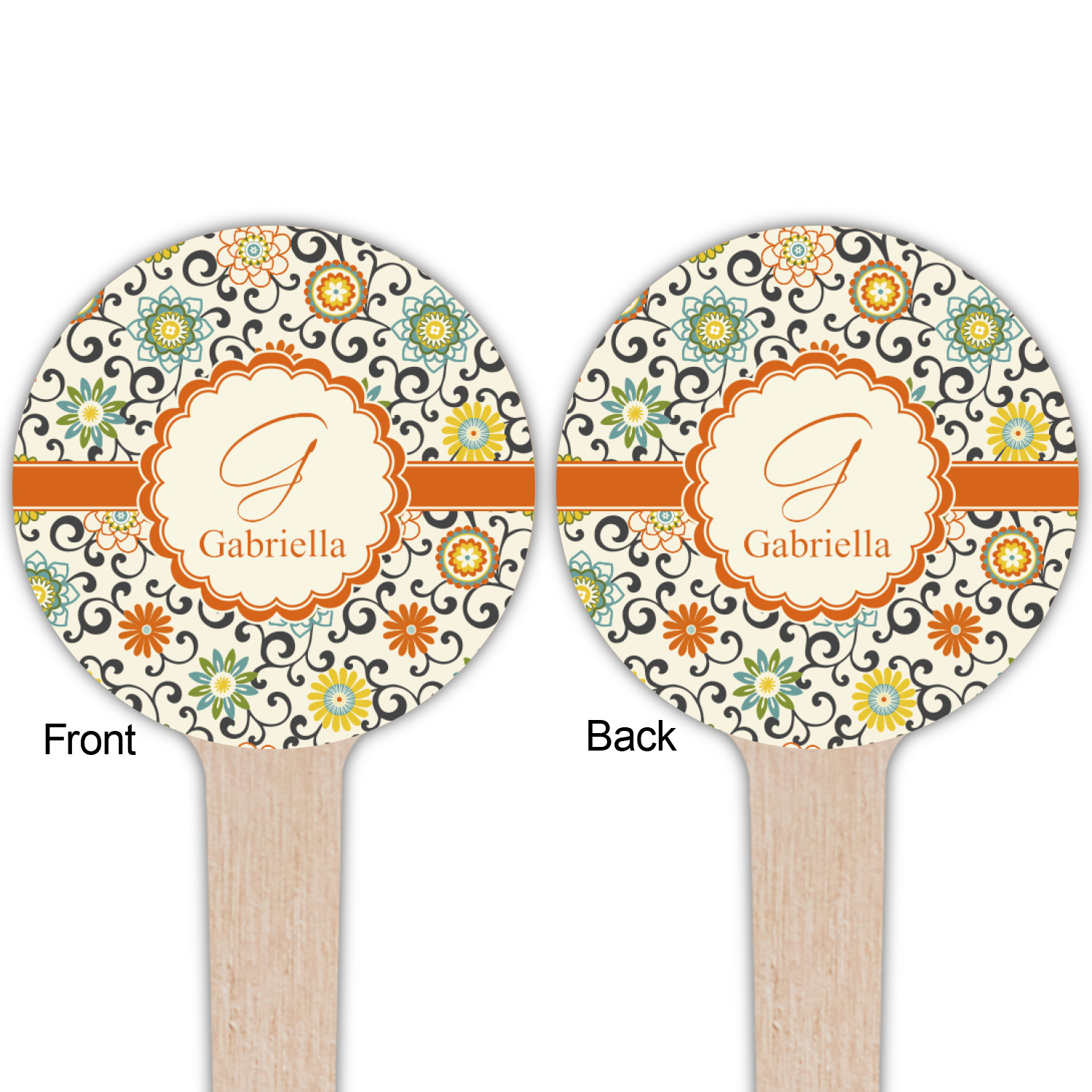 In this floral design the flowers of orange, green, blue, and yellow are connected with swirls of dark gray. The design has a classic ribbon in orange trimmed in off white. The decorative off white scalloped label is trimmed in orange. Add an initial and a name for that personal touch to pull the entire design together.