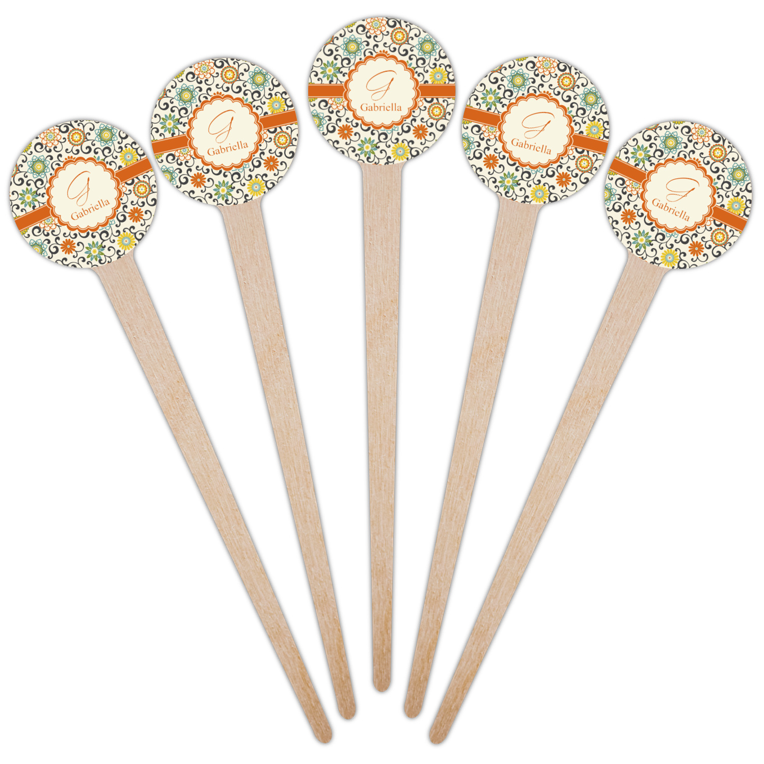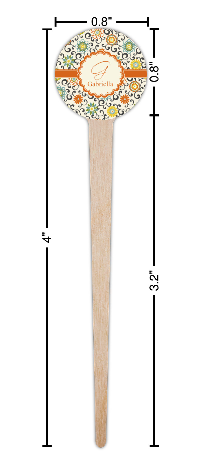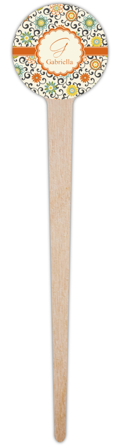 In this floral design the flowers of orange, green, blue, and yellow are connected with swirls of dark gray. The design has a classic ribbon in orange trimmed in off white. The decorative off white scalloped label is trimmed in orange. Add an initial and a name for that personal touch to pull the entire design together.