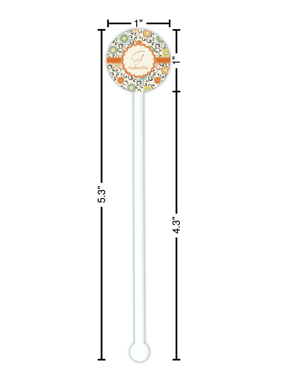 In this floral design the flowers of orange, green, blue, and yellow are connected with swirls of dark gray. The design has a classic ribbon in orange trimmed in off white. The decorative off white scalloped label is trimmed in orange. Add an initial and a name for that personal touch to pull the entire design together.