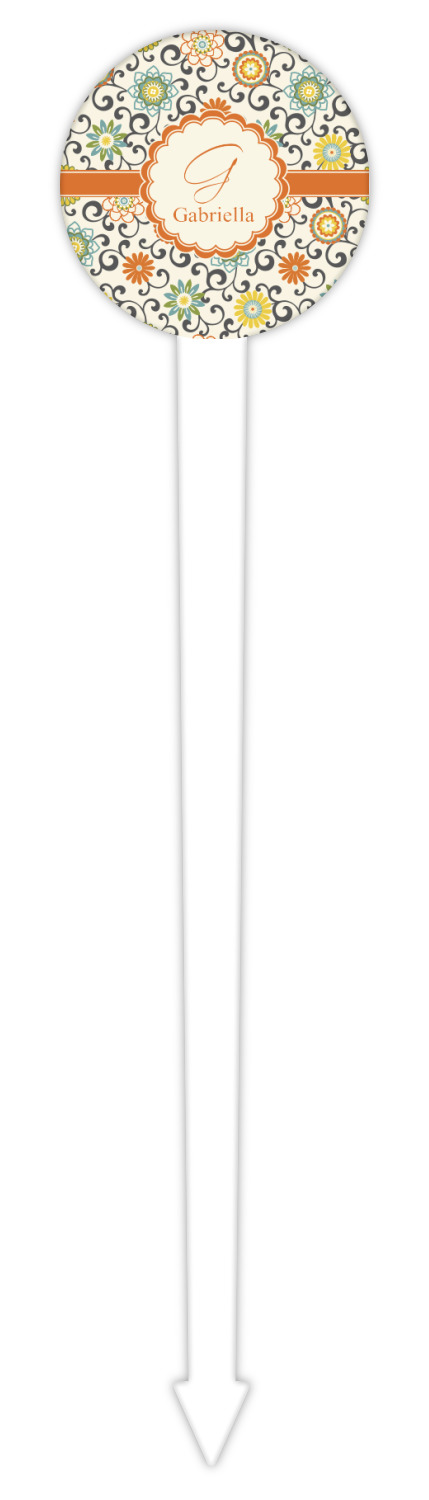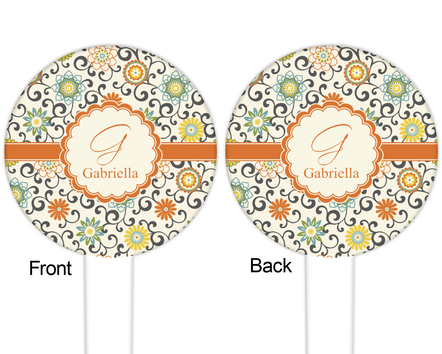 In this floral design the flowers of orange, green, blue, and yellow are connected with swirls of dark gray. The design has a classic ribbon in orange trimmed in off white. The decorative off white scalloped label is trimmed in orange. Add an initial and a name for that personal touch to pull the entire design together.