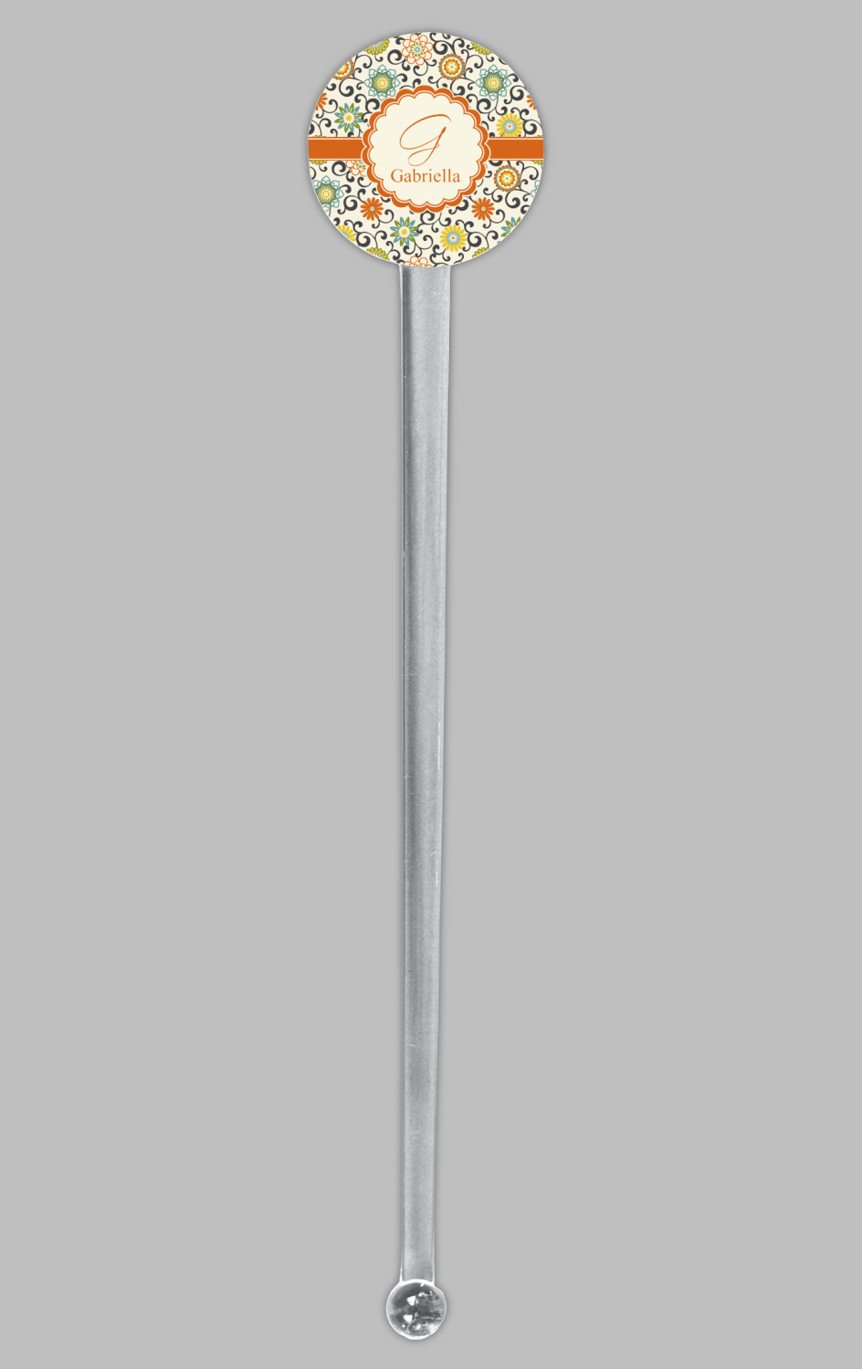 In this floral design the flowers of orange, green, blue, and yellow are connected with swirls of dark gray. The design has a classic ribbon in orange trimmed in off white. The decorative off white scalloped label is trimmed in orange. Add an initial and a name for that personal touch to pull the entire design together.