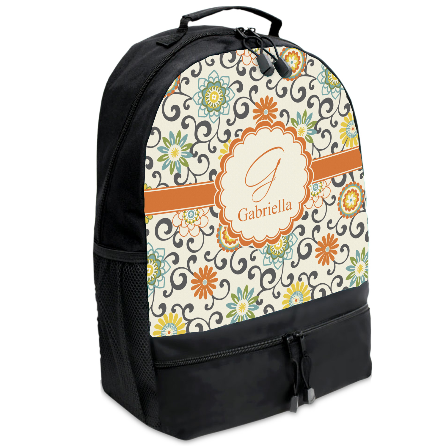 In this floral design the flowers of orange, green, blue, and yellow are connected with swirls of dark gray. The design has a classic ribbon in orange trimmed in off white. The decorative off white scalloped label is trimmed in orange. Add an initial and a name for that personal touch to pull the entire design together.