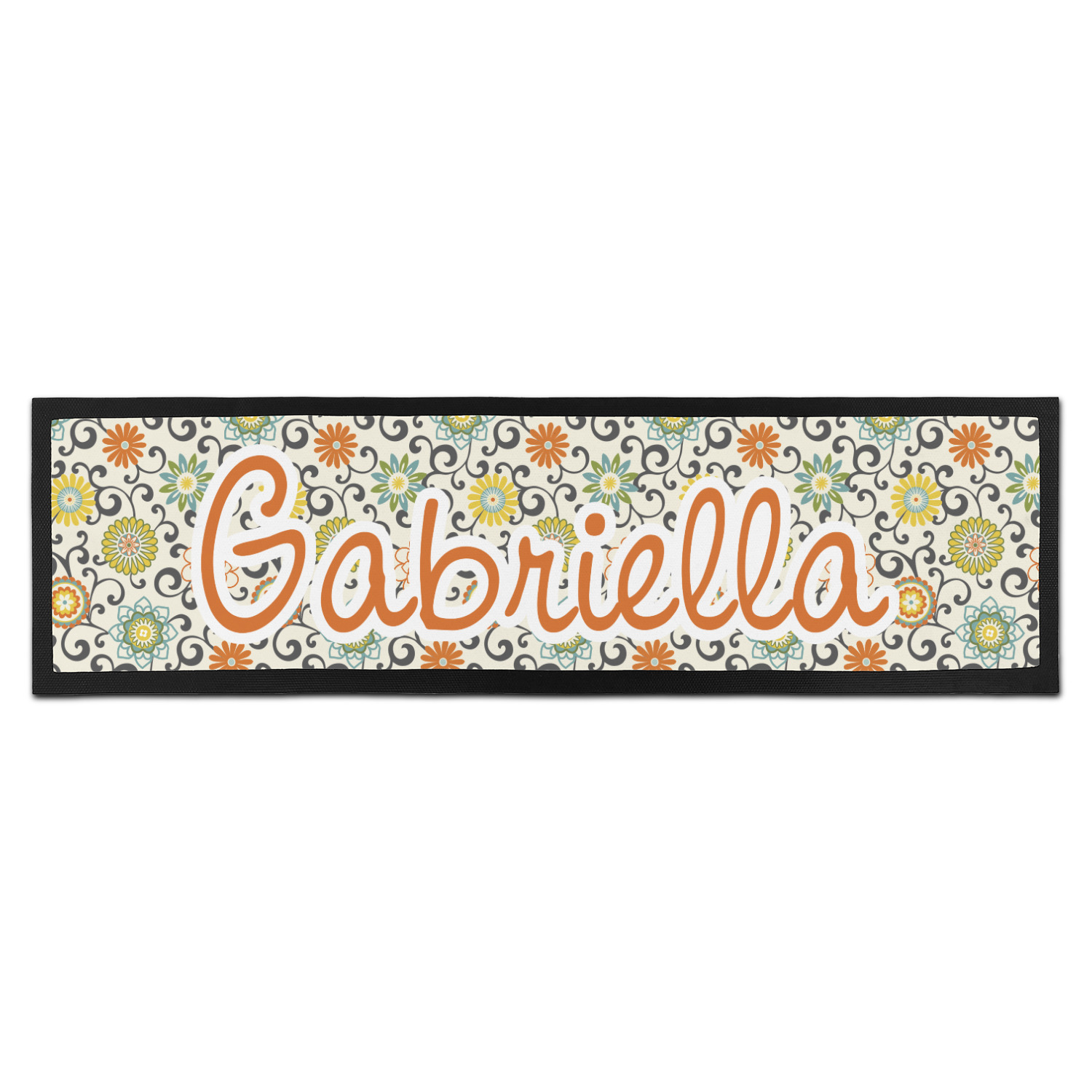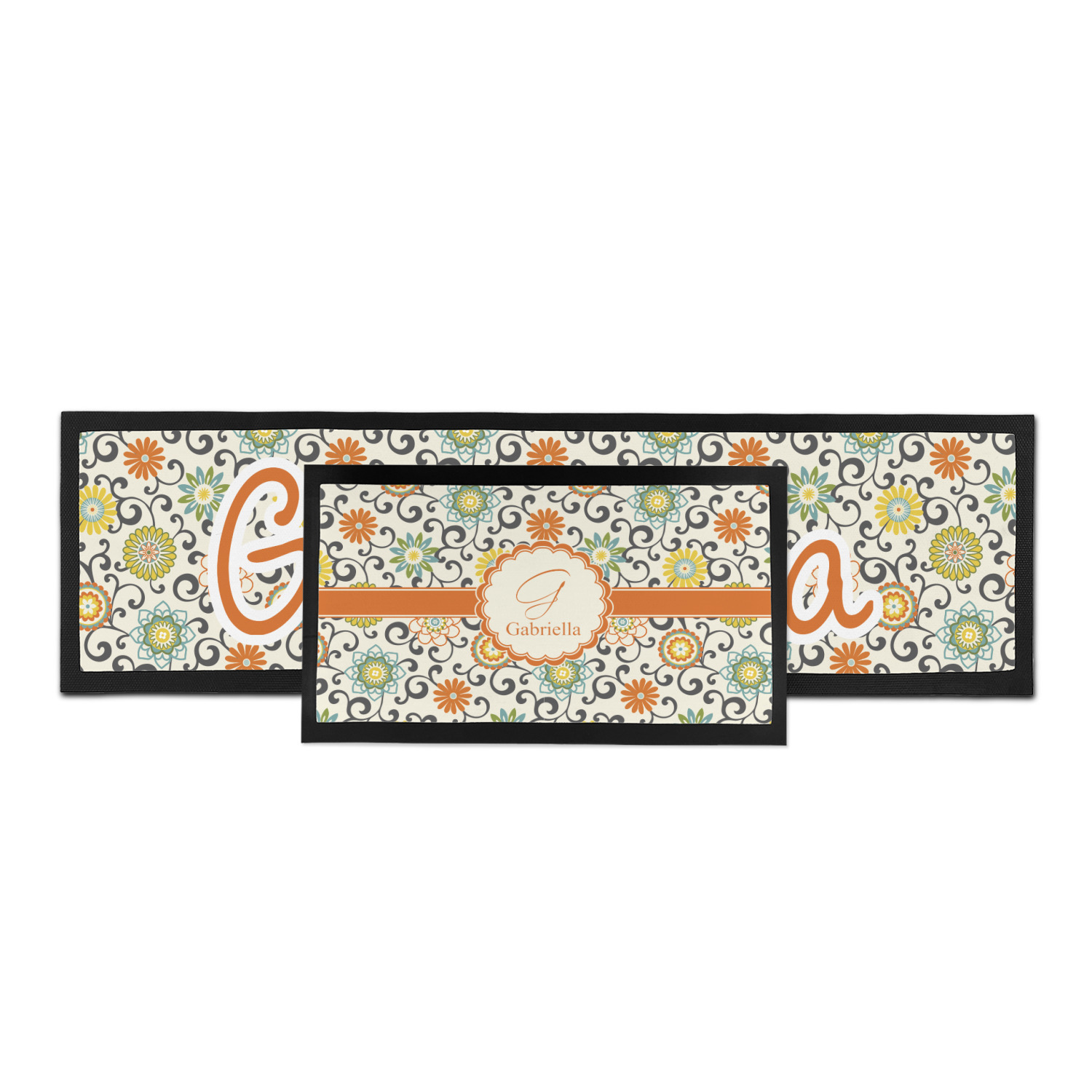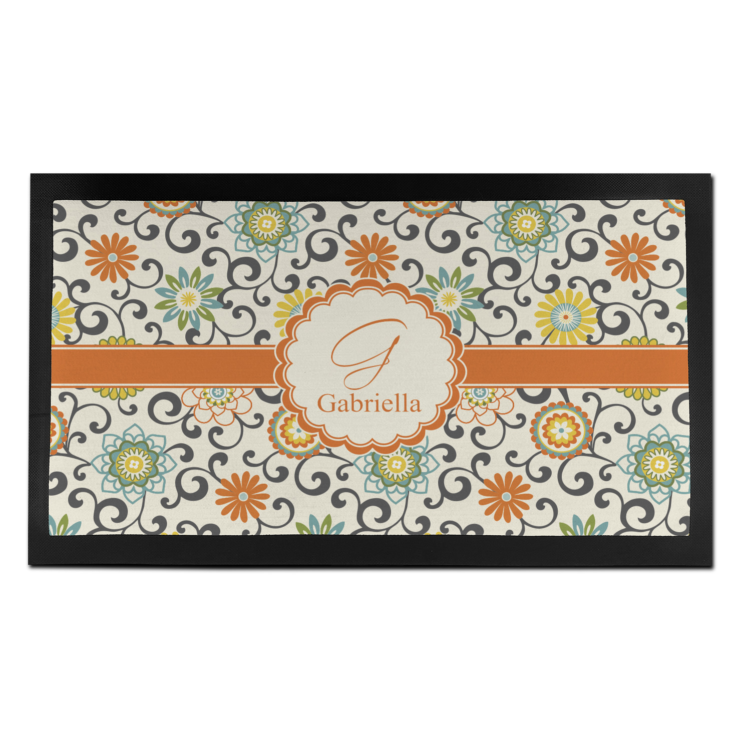 In this floral design the flowers of orange, green, blue, and yellow are connected with swirls of dark gray. The design has a classic ribbon in orange trimmed in off white. The decorative off white scalloped label is trimmed in orange. Add an initial and a name for that personal touch to pull the entire design together.