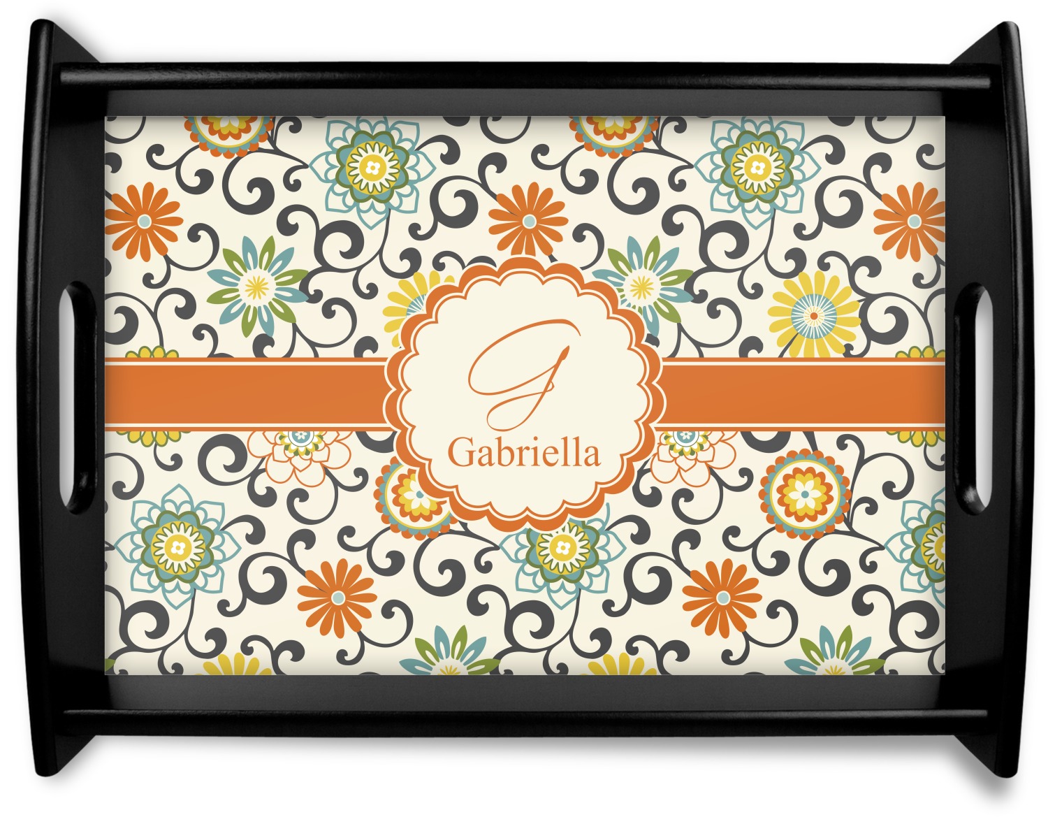 In this floral design the flowers of orange, green, blue, and yellow are connected with swirls of dark gray. The design has a classic ribbon in orange trimmed in off white. The decorative off white scalloped label is trimmed in orange. Add an initial and a name for that personal touch to pull the entire design together.