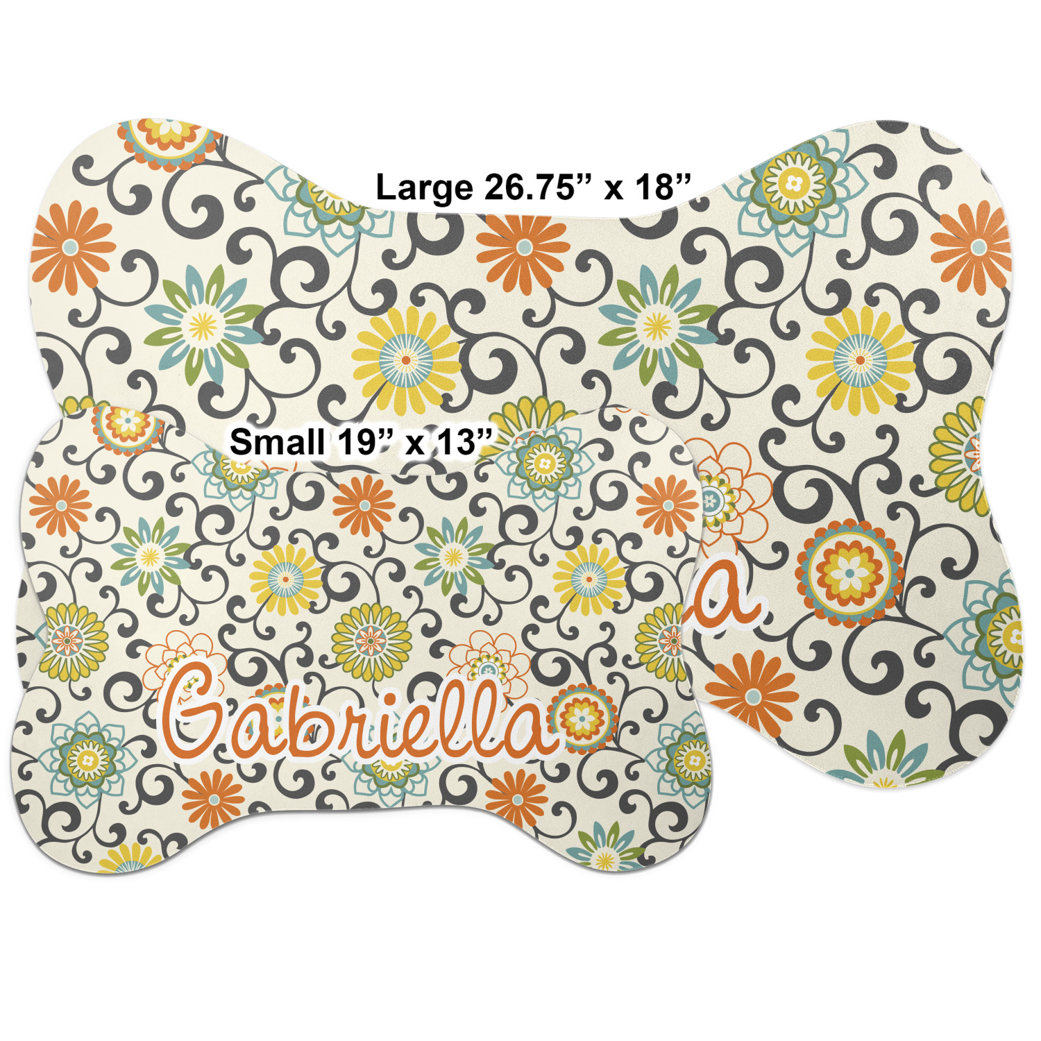 The top of this mat displays your custom design, as it is printed on polyester. To prevent slippage, the underside of the mat is made of rubber. We offer a small dog food mat, suitable for smaller dogs and a large dog food mat for bigger breeds. The small dog food mat is approximately 19 by 13 inches, while the large dog feeding mat measures at approximately 26.75 by 18 inches. Both personalized mats are ideally sized to fit two dog bowls.