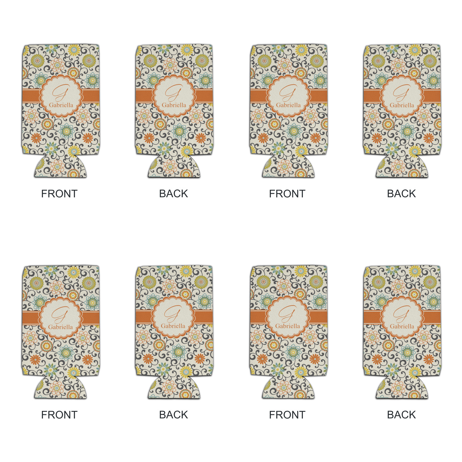 In this floral design the flowers of orange, green, blue, and yellow are connected with swirls of dark gray. The design has a classic ribbon in orange trimmed in off white. The decorative off white scalloped label is trimmed in orange. Add an initial and a name for that personal touch to pull the entire design together.