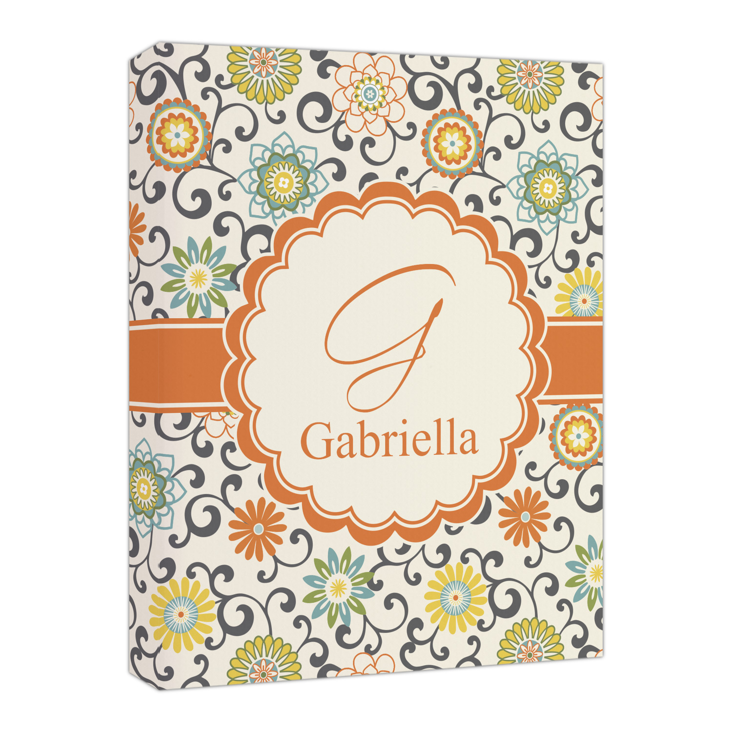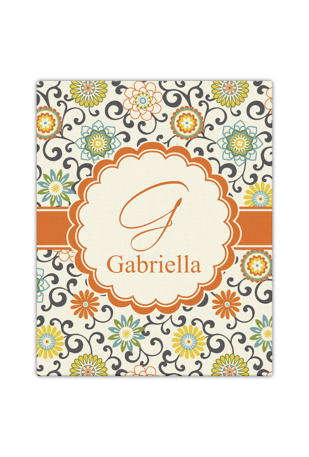 In this floral design the flowers of orange, green, blue, and yellow are connected with swirls of dark gray. The design has a classic ribbon in orange trimmed in off white. The decorative off white scalloped label is trimmed in orange. Add an initial and a name for that personal touch to pull the entire design together.