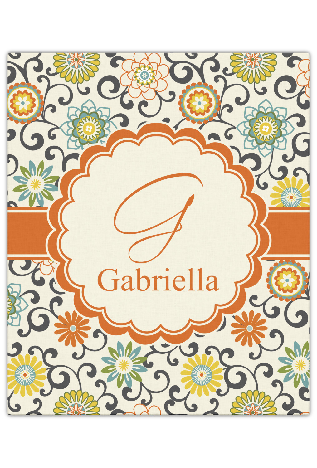 In this floral design the flowers of orange, green, blue, and yellow are connected with swirls of dark gray. The design has a classic ribbon in orange trimmed in off white. The decorative off white scalloped label is trimmed in orange. Add an initial and a name for that personal touch to pull the entire design together.