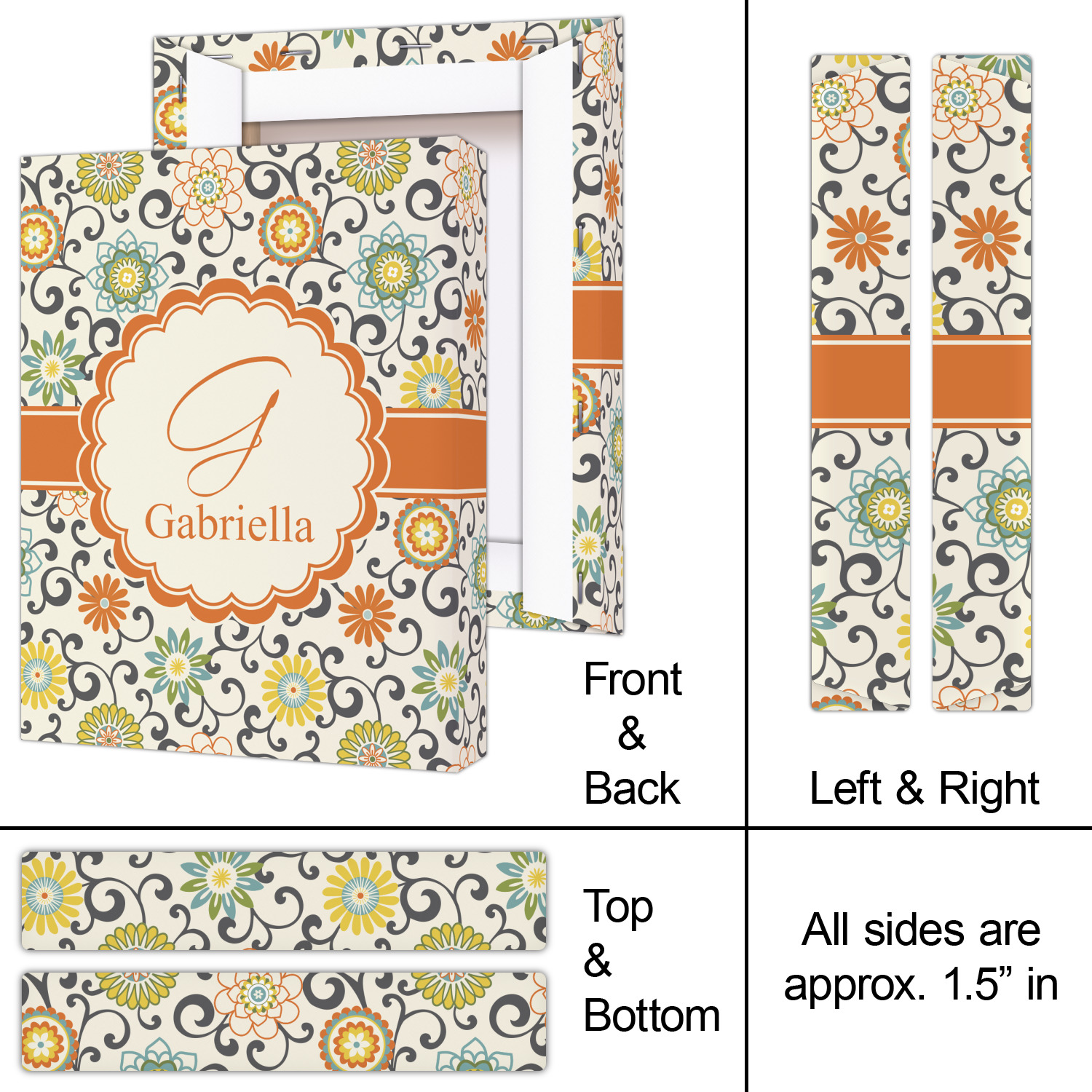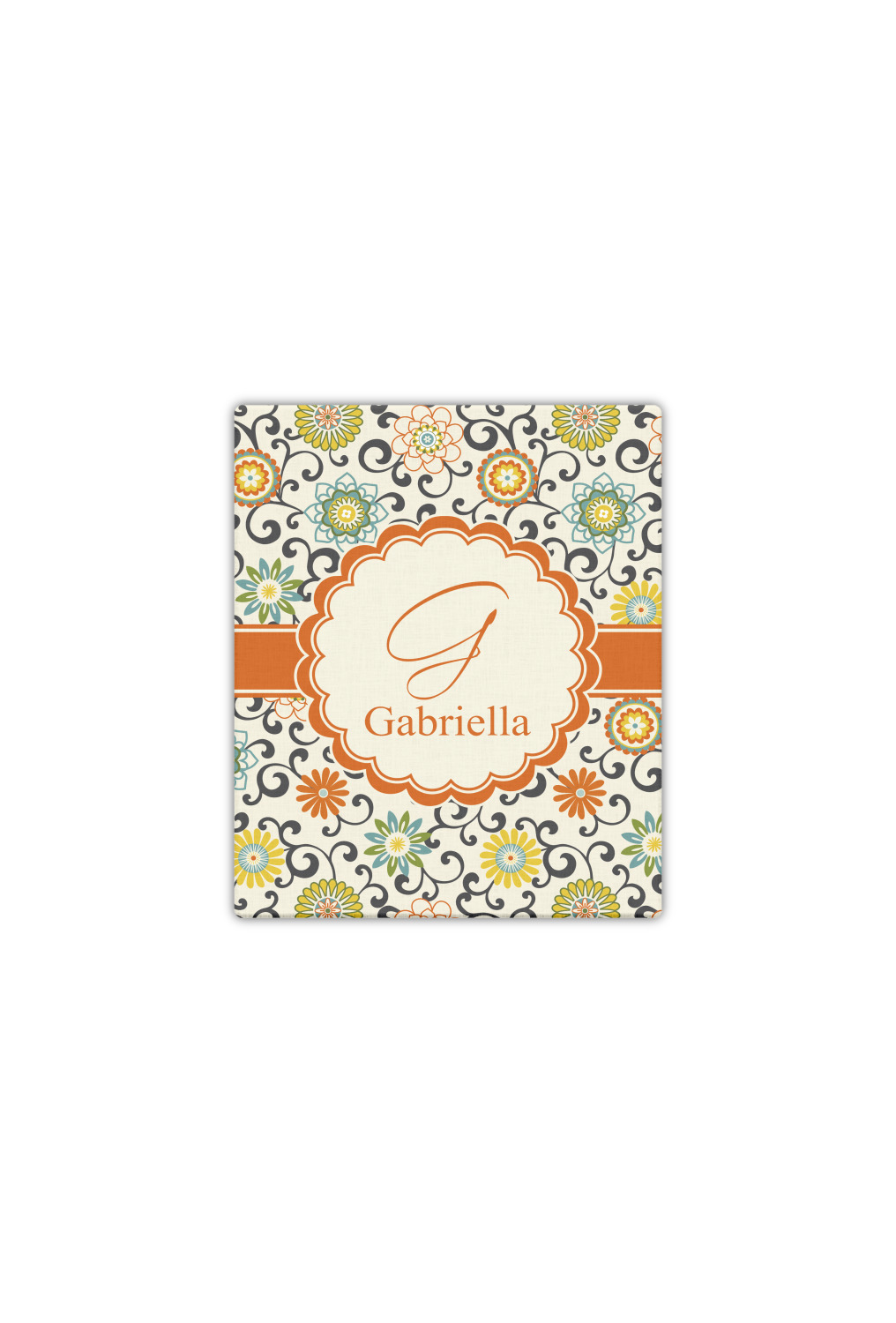 In this floral design the flowers of orange, green, blue, and yellow are connected with swirls of dark gray. The design has a classic ribbon in orange trimmed in off white. The decorative off white scalloped label is trimmed in orange. Add an initial and a name for that personal touch to pull the entire design together.
