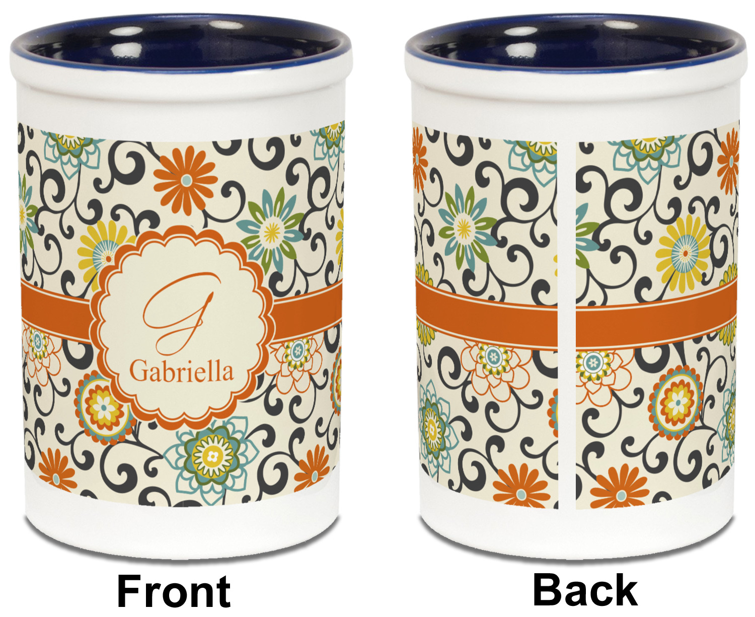 In this floral design the flowers of orange, green, blue, and yellow are connected with swirls of dark gray. The design has a classic ribbon in orange trimmed in off white. The decorative off white scalloped label is trimmed in orange. Add an initial and a name for that personal touch to pull the entire design together.