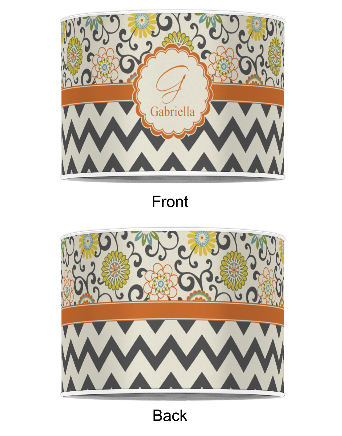 The design has a classic ribbon in orange trimmed in white. The decorative white scalloped label is trimmed in orange. Add an initial and a name for that personal touch to pull the entire design together.