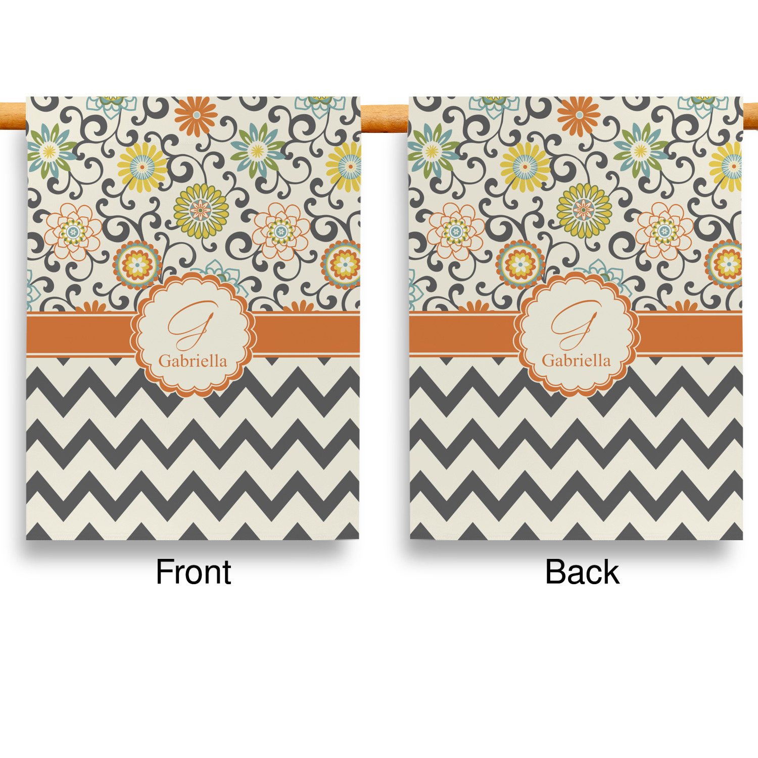 The design has a classic ribbon in orange trimmed in white. The decorative white scalloped label is trimmed in orange. Add an initial and a name for that personal touch to pull the entire design together.