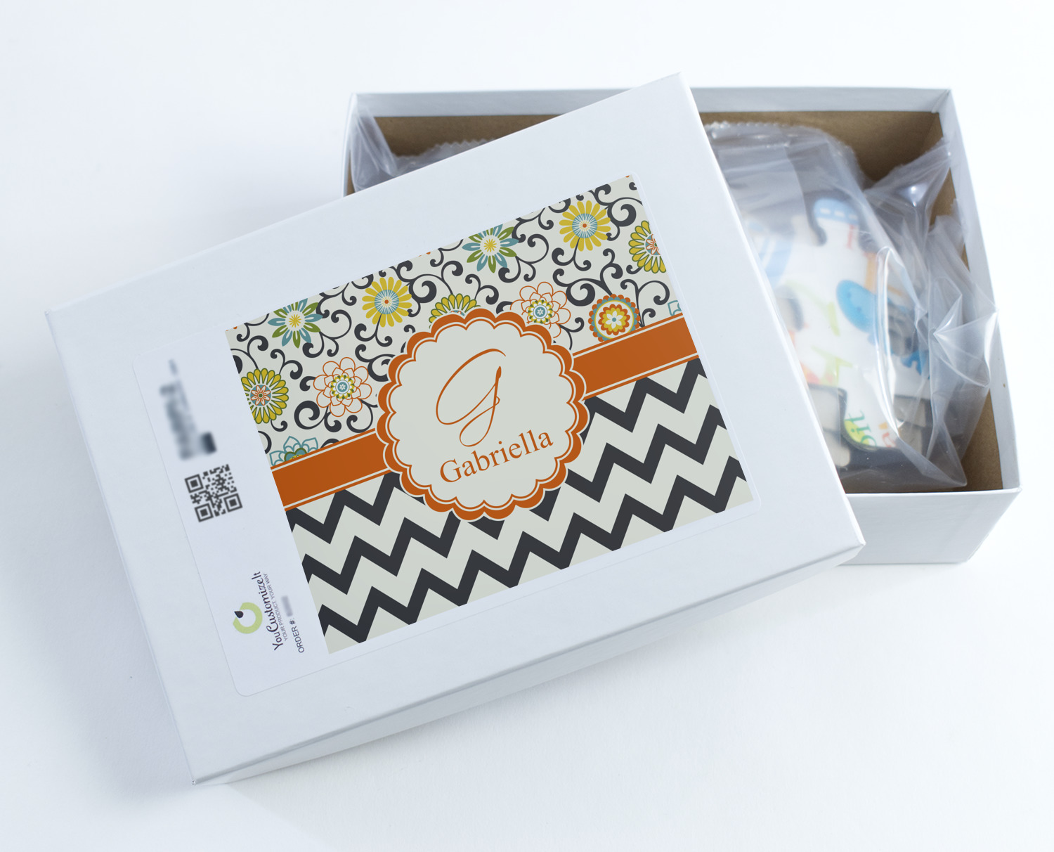 The design has a classic ribbon in orange trimmed in white. The decorative white scalloped label is trimmed in orange. Add an initial and a name for that personal touch to pull the entire design together.