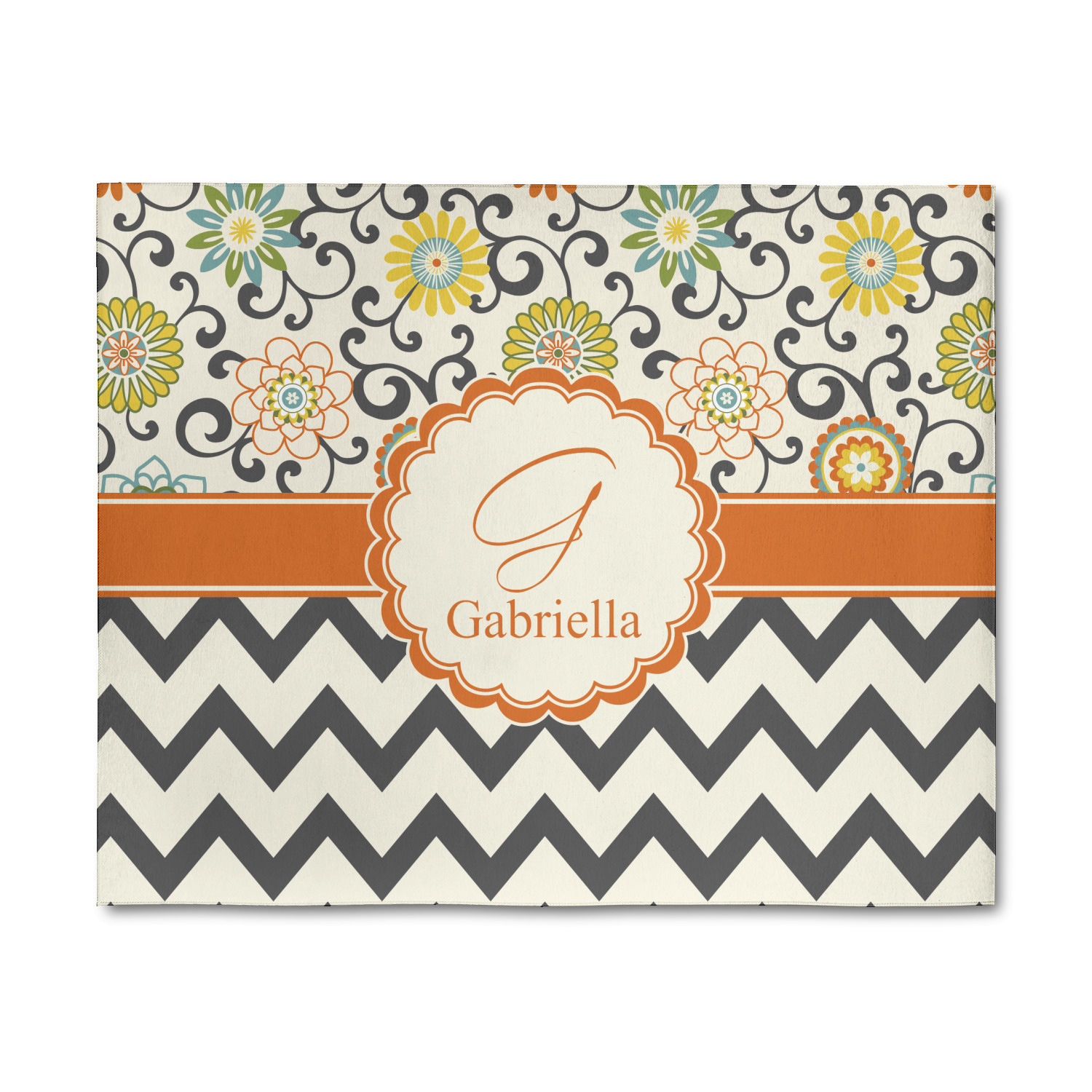 Love those 1970 retro colors but don't love the designs that come with the look? We have brought retro back to being relevant with this gorgeous swirls and floral pattern with a modern chevron pairing. The top of the design renews the orange, green, blue, and yellow but adds a modern twist by using dark gray. The floral pattern is set on a background of white to make this print come to life. The bottom of the design has the classic dark gray and white chevron print