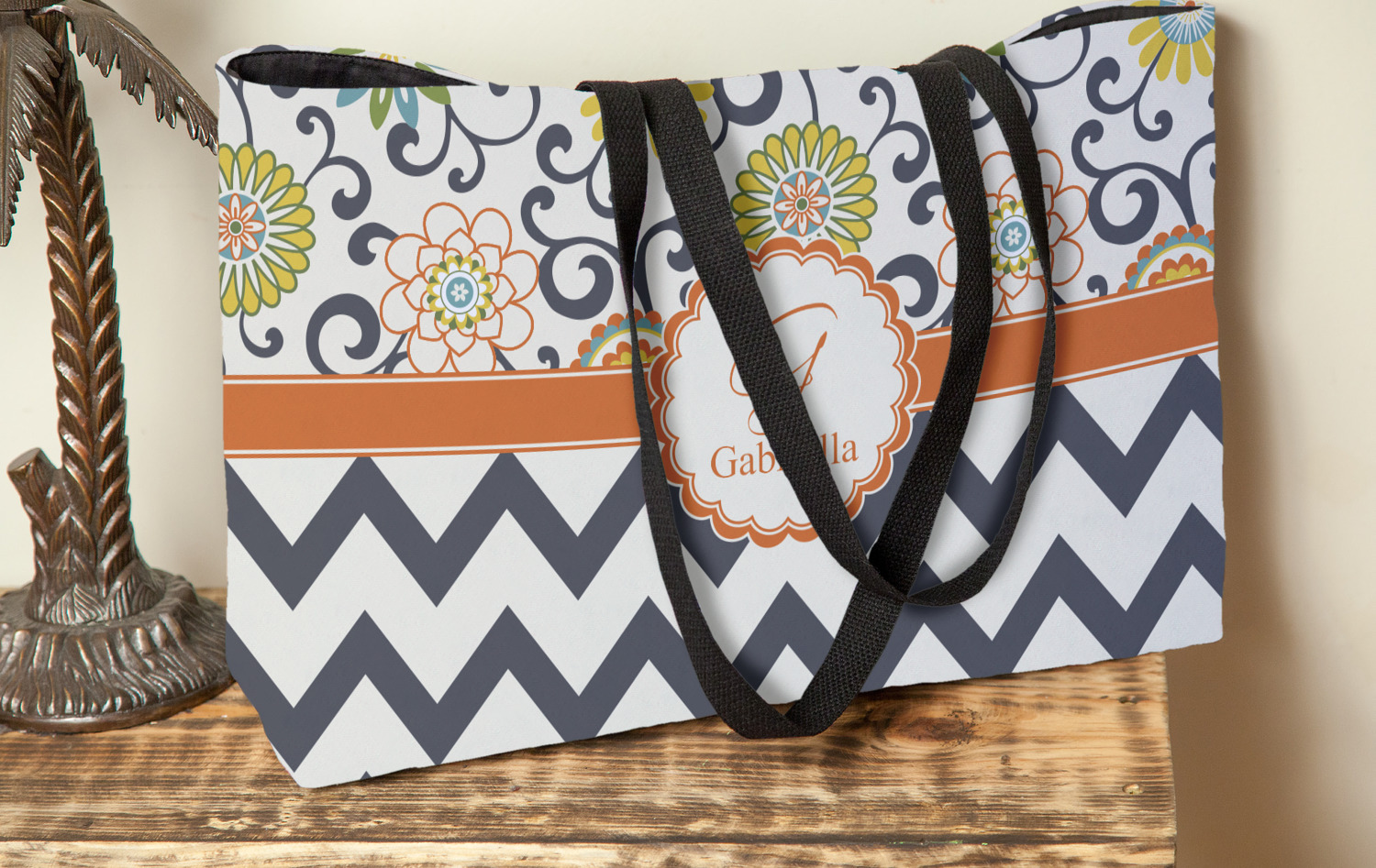 These beach totes are handmade here in the USA. Fabric is printed with your design. The tote is then sewn from the fabric pieces, lining and handles added.