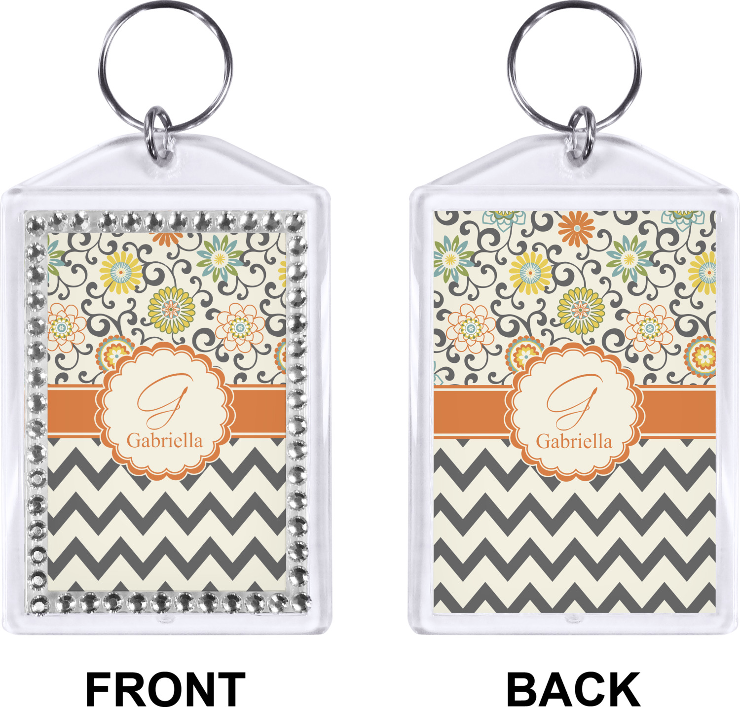 Our personalized keychains have a bold, rectangular shape, outlined by a series of shimmering rhinestones. A metal, split keyring is included with your purchase, and an additional metal hoop allows for attachment of the keychain to the split ring. This unique keychain measures at about 3.75 by 2.5 inches. We print your customized design(s) across both the back and front of this keychain.