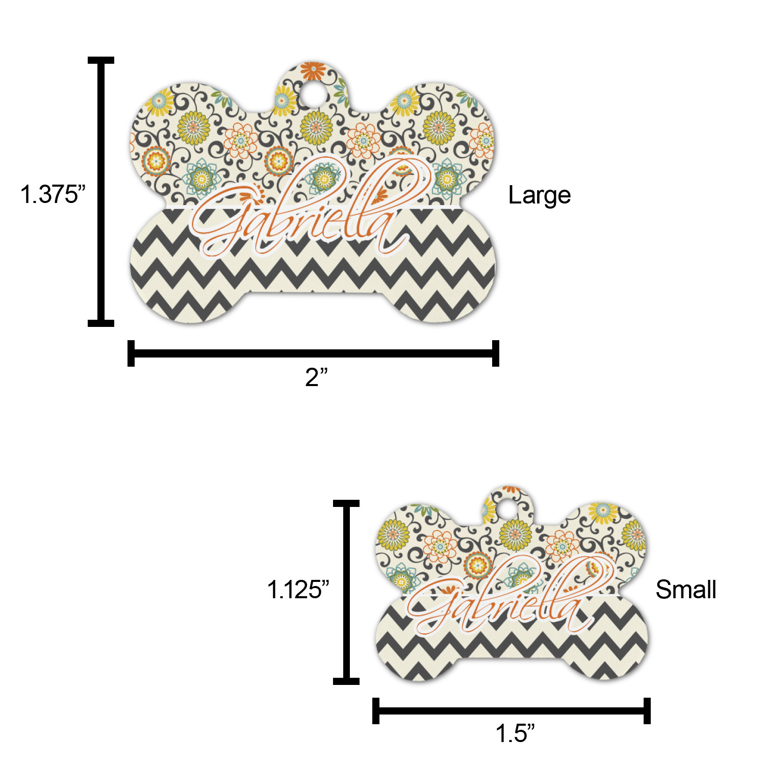 The small bone dog tag size is perfect to pair with our small dog collars, the large size pairs well with our large dog collars.