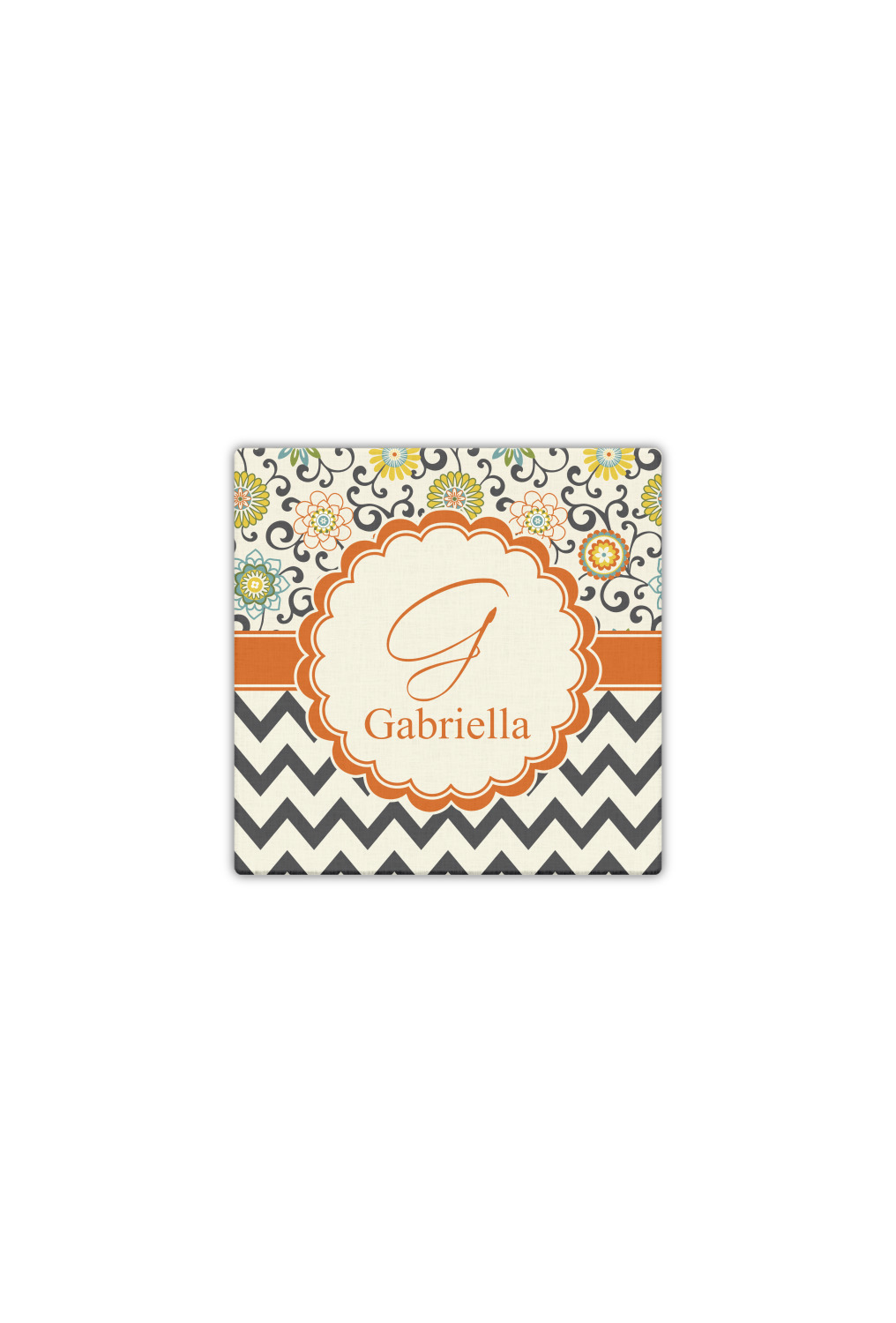 The design has a classic ribbon in orange trimmed in white. The decorative white scalloped label is trimmed in orange. Add an initial and a name for that personal touch to pull the entire design together.
