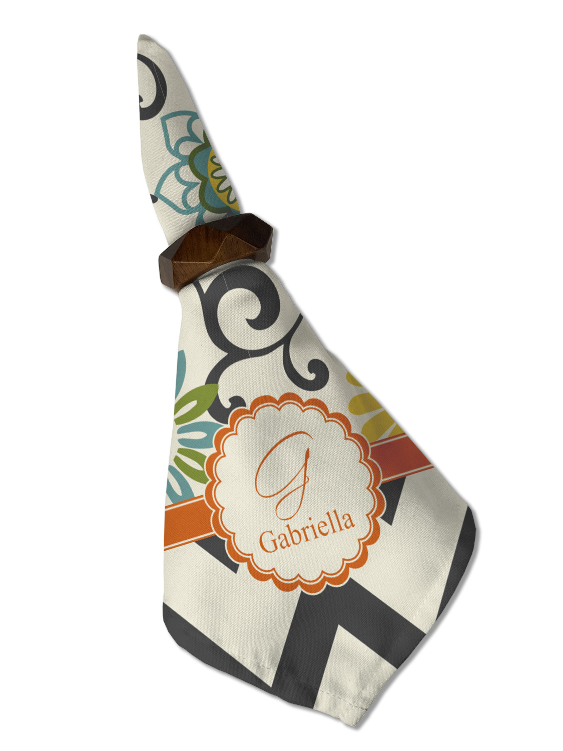 The design has a classic ribbon in orange trimmed in white. The decorative white scalloped label is trimmed in orange. Add an initial and a name for that personal touch to pull the entire design together.