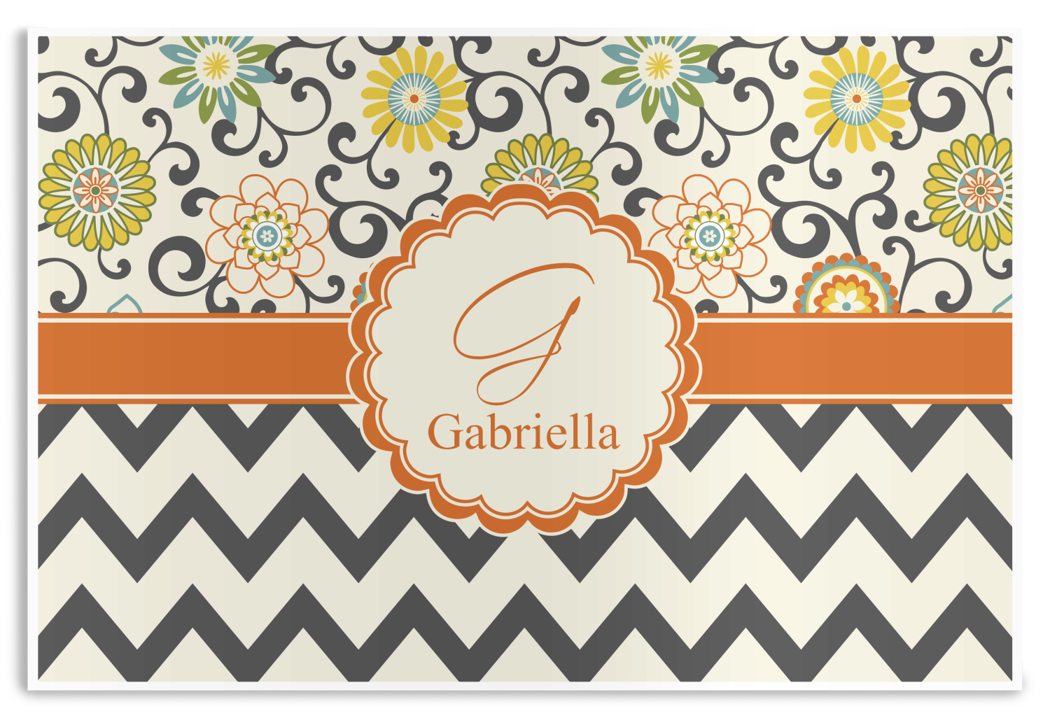 Love those 1970 retro colors but don't love the designs that come with the look? We have brought retro back to being relevant with this gorgeous swirls and floral pattern with a modern chevron pairing. The top of the design renews the orange, green, blue, and yellow but adds a modern twist by using dark gray. The floral pattern is set on a background of white to make this print come to life. The bottom of the design has the classic dark gray and white chevron print