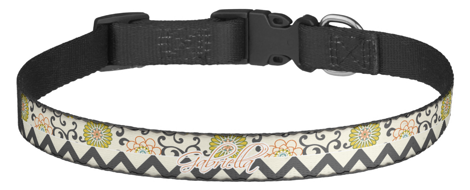 This sturdy collar, made from a durable nylon weave, will outlive your dog's episodes of excited tugging and pulling. Courtesy of its thick plastic buckle and adjuster, this collar is adjustable and accommodating of any dog. Structurally, the collar is a single piece of nylon weave that is sewn together, and features a solid metal loop where you can attach a leash or dog tag. We print and display your dog's name and pattern across the middle of the personalized dog collar.
