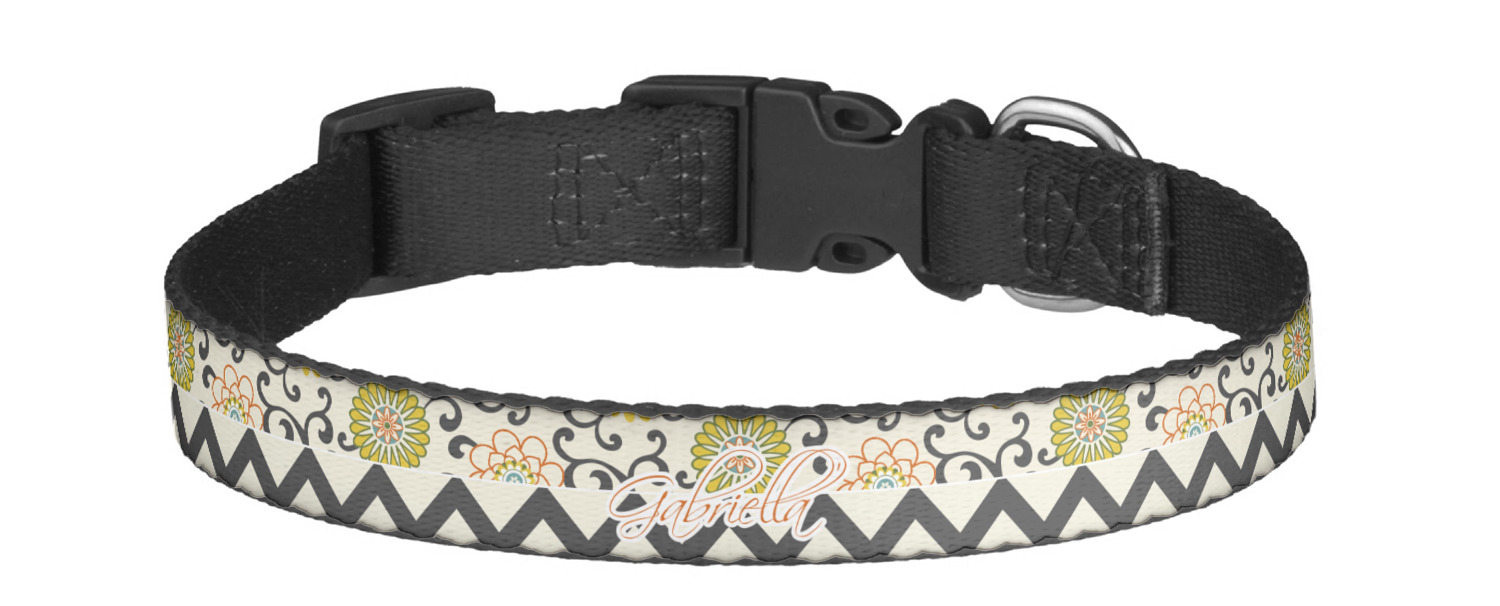 This sturdy collar, made from a durable nylon weave, will outlive your dog's episodes of excited tugging and pulling. Courtesy of its thick plastic buckle and adjuster, this collar is adjustable and accommodating of any dog. Structurally, the collar is a single piece of nylon weave that is sewn together, and features a solid metal loop where you can attach a leash or dog tag. We print and display your dog's name and pattern across the middle of the personalized dog collar.