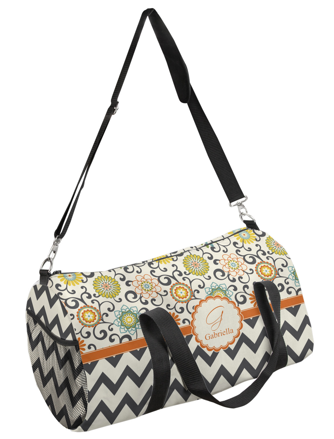 This duffle is a sturdy bag made of a canvas material. It comes in two sizes: Small (19"W x 9.5"H x 9.5"D) and Large (23"W x 12"H x 12"D). The bag is a cylindrical shape with a black adjustable strap and two handles. On one side is an elastic pouch to put a waterbottle or other small item. Your product will be sublimated with your design and is able to be designed on the front, back, and sides. Be sure to remember that the straps may cut into parts of your design if you upload your own artwork.