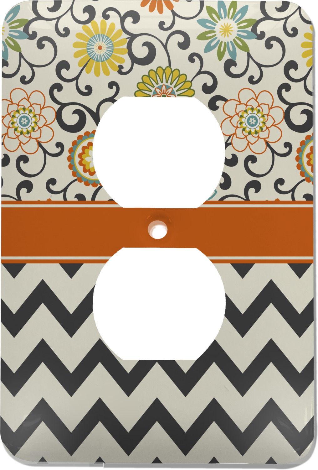 These outlet covers are made from a sturdy metal and display your design across its face. A satin finish coats the design to give it a finished look. The center of this outlet plate cover has a small hole to accommodate a screw upon installation. With your purchase of this decorative outlet cover, we include one screw. This outlet plate is of a standard size, and measures at approximately 3.5 by 5 inches.
