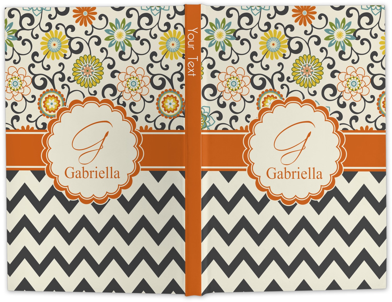 The design has a classic ribbon in orange trimmed in white. The decorative white scalloped label is trimmed in orange. Add an initial and a name for that personal touch to pull the entire design together.