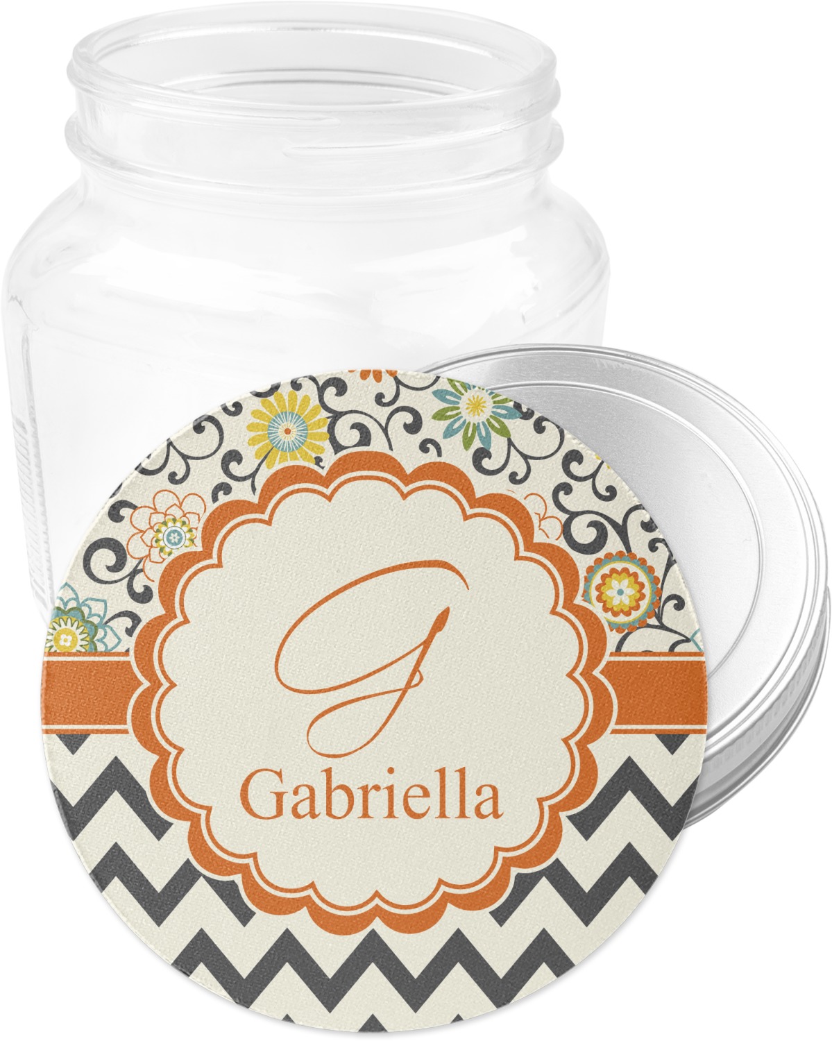The design has a classic ribbon in orange trimmed in white. The decorative white scalloped label is trimmed in orange. Add an initial and a name for that personal touch to pull the entire design together.