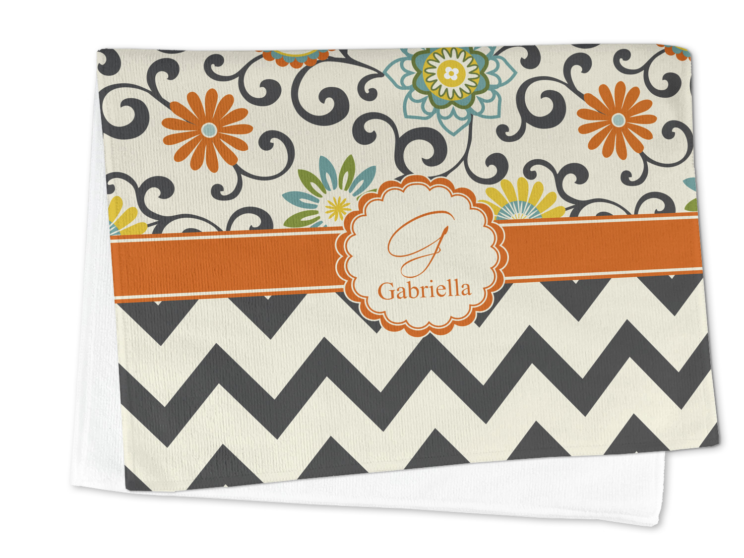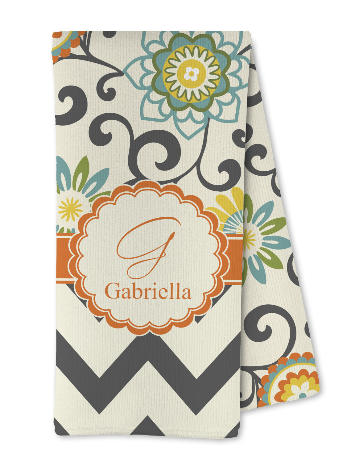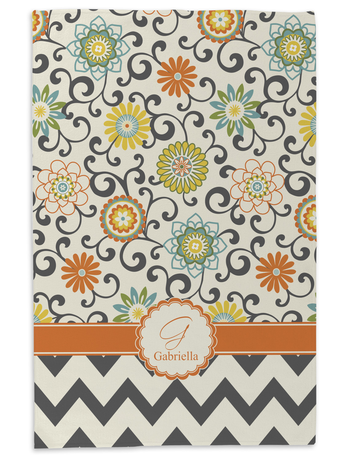 Love those 1970 retro colors but don't love the designs that come with the look? We have brought retro back to being relevant with this gorgeous swirls and floral pattern with a modern chevron pairing. The top of the design renews the orange, green, blue, and yellow but adds a modern twist by using dark gray. The floral pattern is set on a background of white to make this print come to life. The bottom of the design has the classic dark gray and white chevron print
