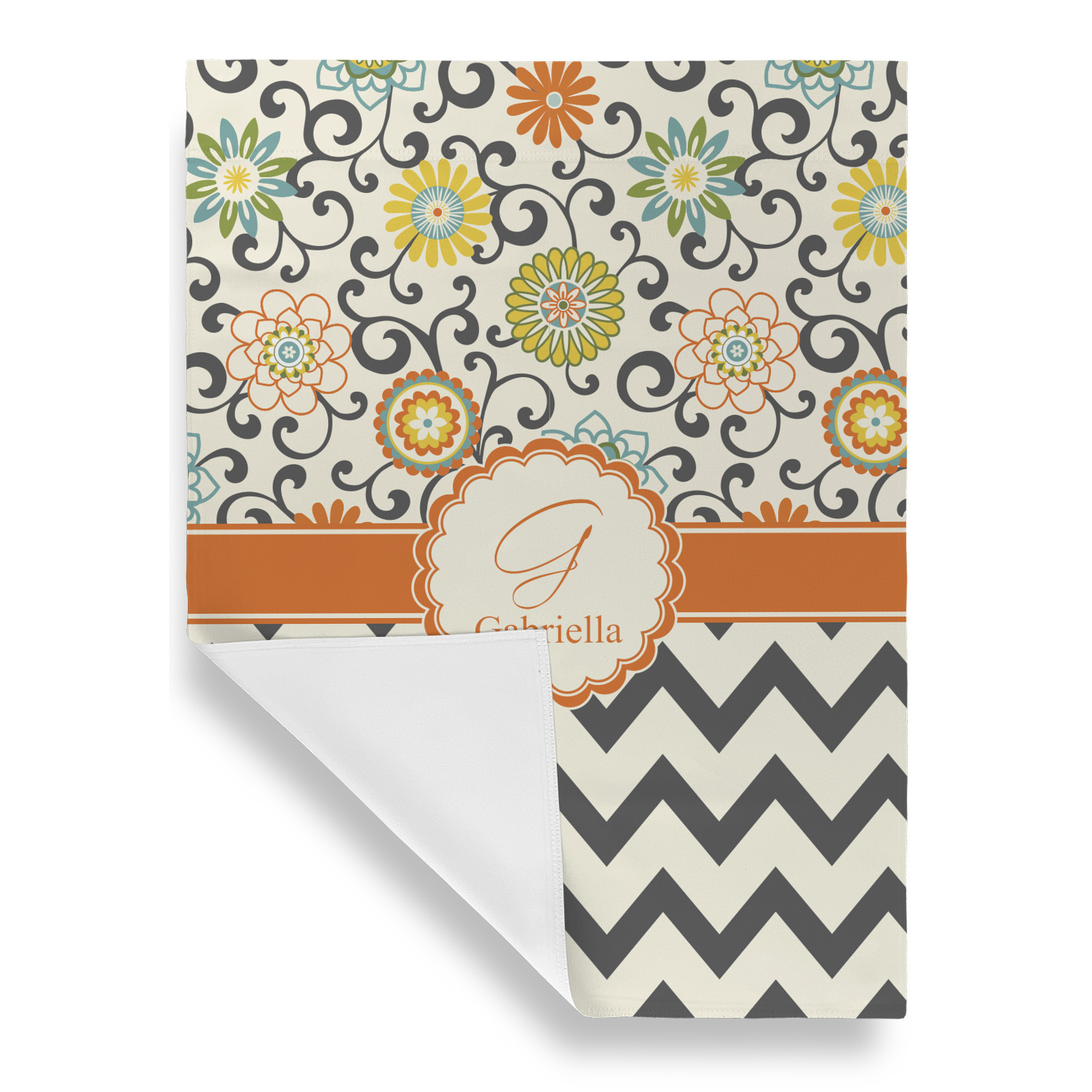 Love those 1970 retro colors but don't love the designs that come with the look? We have brought retro back to being relevant with this gorgeous swirls and floral pattern with a modern chevron pairing. The top of the design renews the orange, green, blue, and yellow but adds a modern twist by using dark gray. The floral pattern is set on a background of white to make this print come to life. The bottom of the design has the classic dark gray and white chevron print