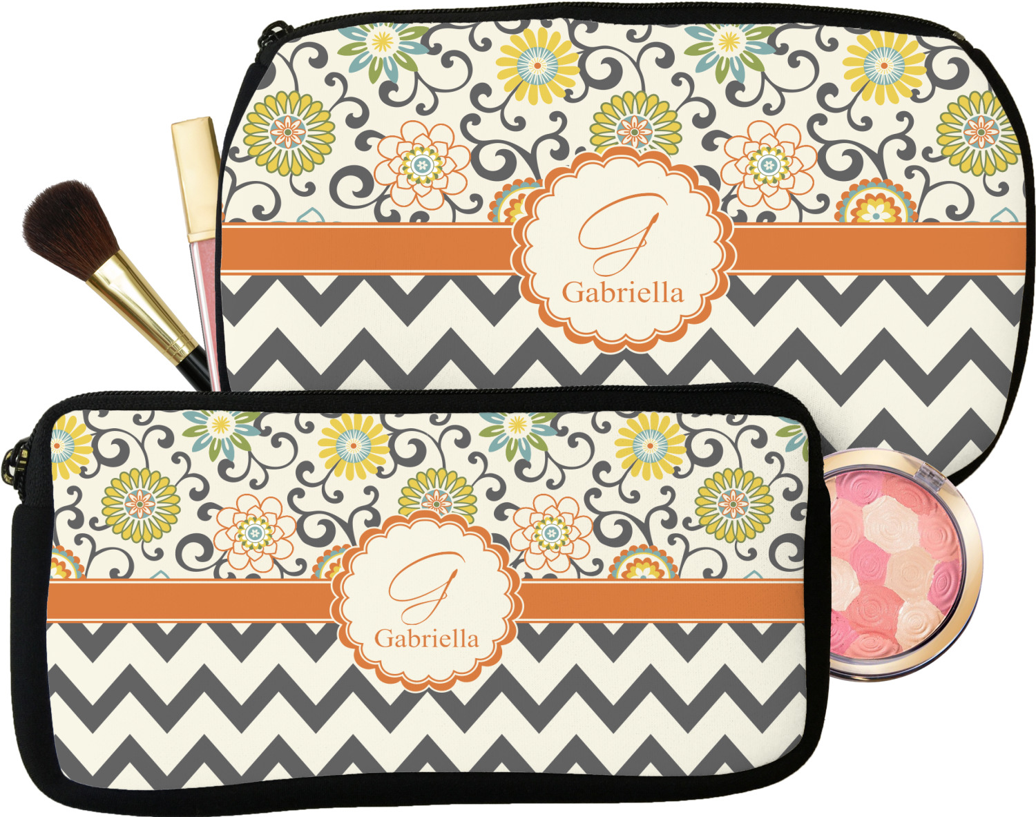Our personalized makeup bags are available in many different designs, patterns and colors - so you are sure to find one that will love. They are made of neoprene (same material as wet-suits) and thus are water resistant, so spillages in your makeup bag will not end up all over you purse. They are customized on one side and are black on the other side and the zipper is black as well.