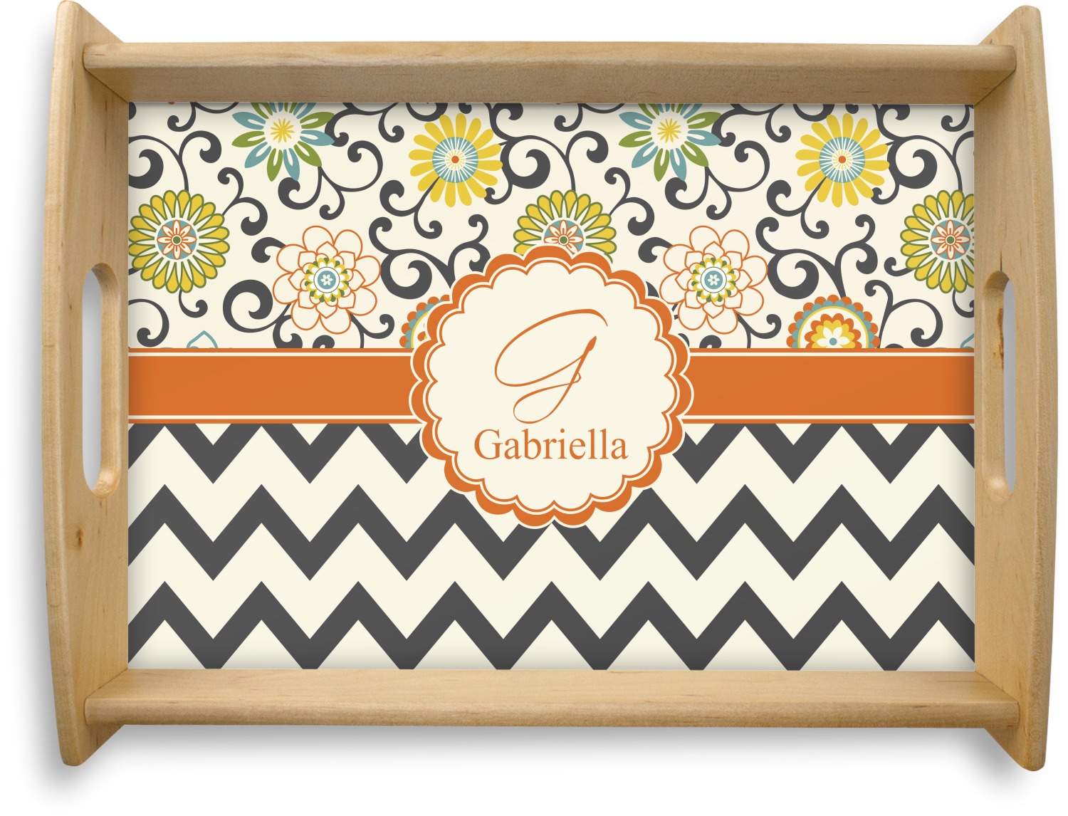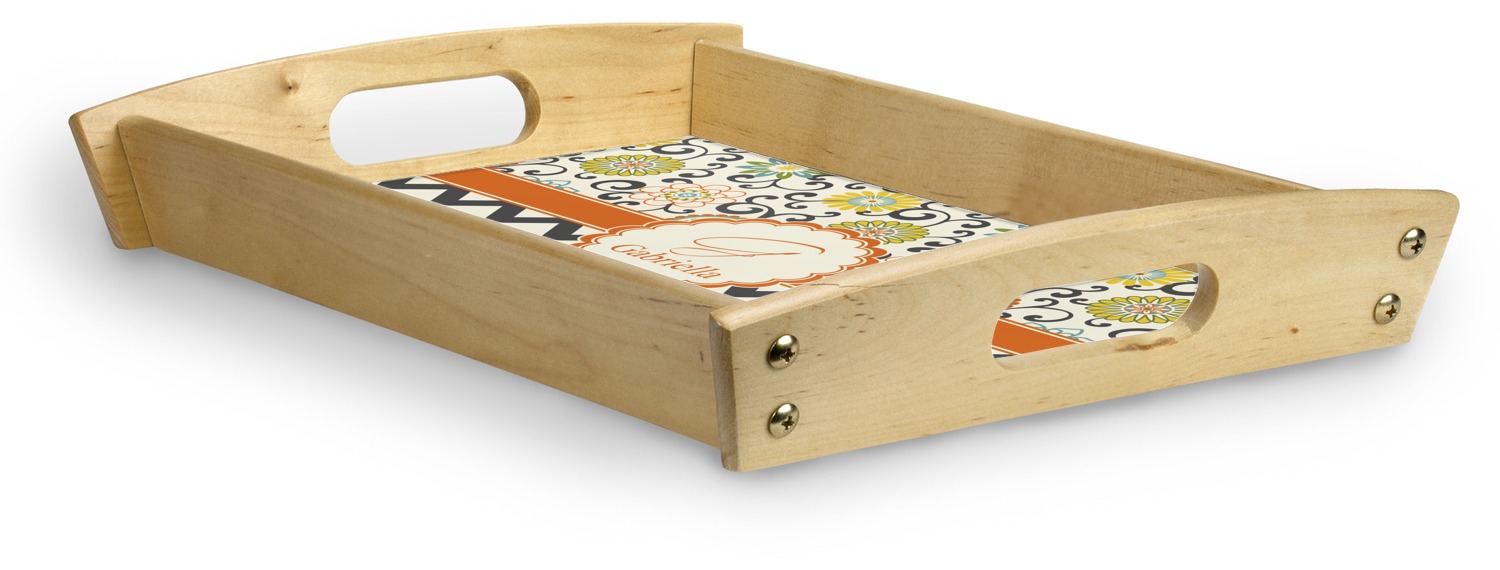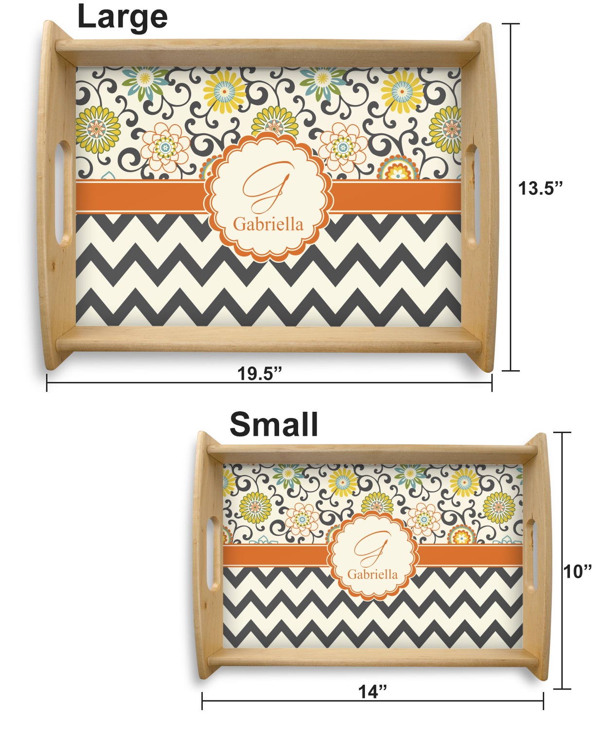 This serving tray with handles features square edges and two rounded sides, creating a very modern look. Each side is fabricated from a beautifully cut, natural wood. The bottom of the interior of the tray displays your customized design in bright, vibrant color. The tray is sold in both a black color and a natural wood look. Each variation of the wood serving tray has two sizes: Small, which is 14" x 10" x 2.25", and Large, which is 19.5" x 13.5" x 2.75".