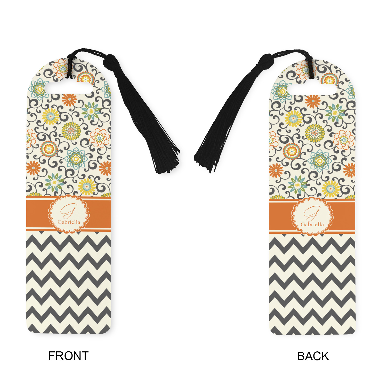The design has a classic ribbon in orange trimmed in white. The decorative white scalloped label is trimmed in orange. Add an initial and a name for that personal touch to pull the entire design together.
