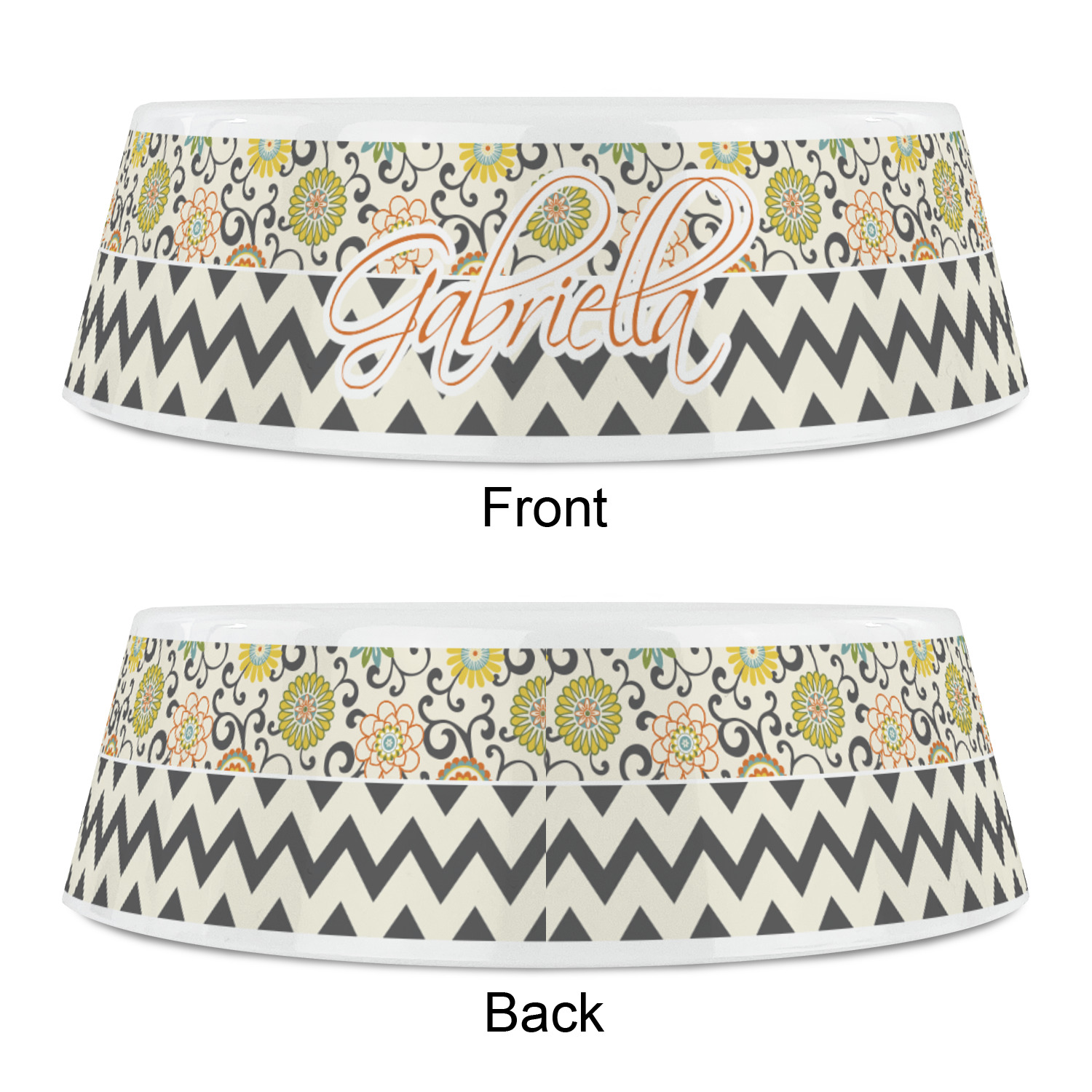 The design has a classic ribbon in orange trimmed in white. The decorative white scalloped label is trimmed in orange. Add an initial and a name for that personal touch to pull the entire design together.