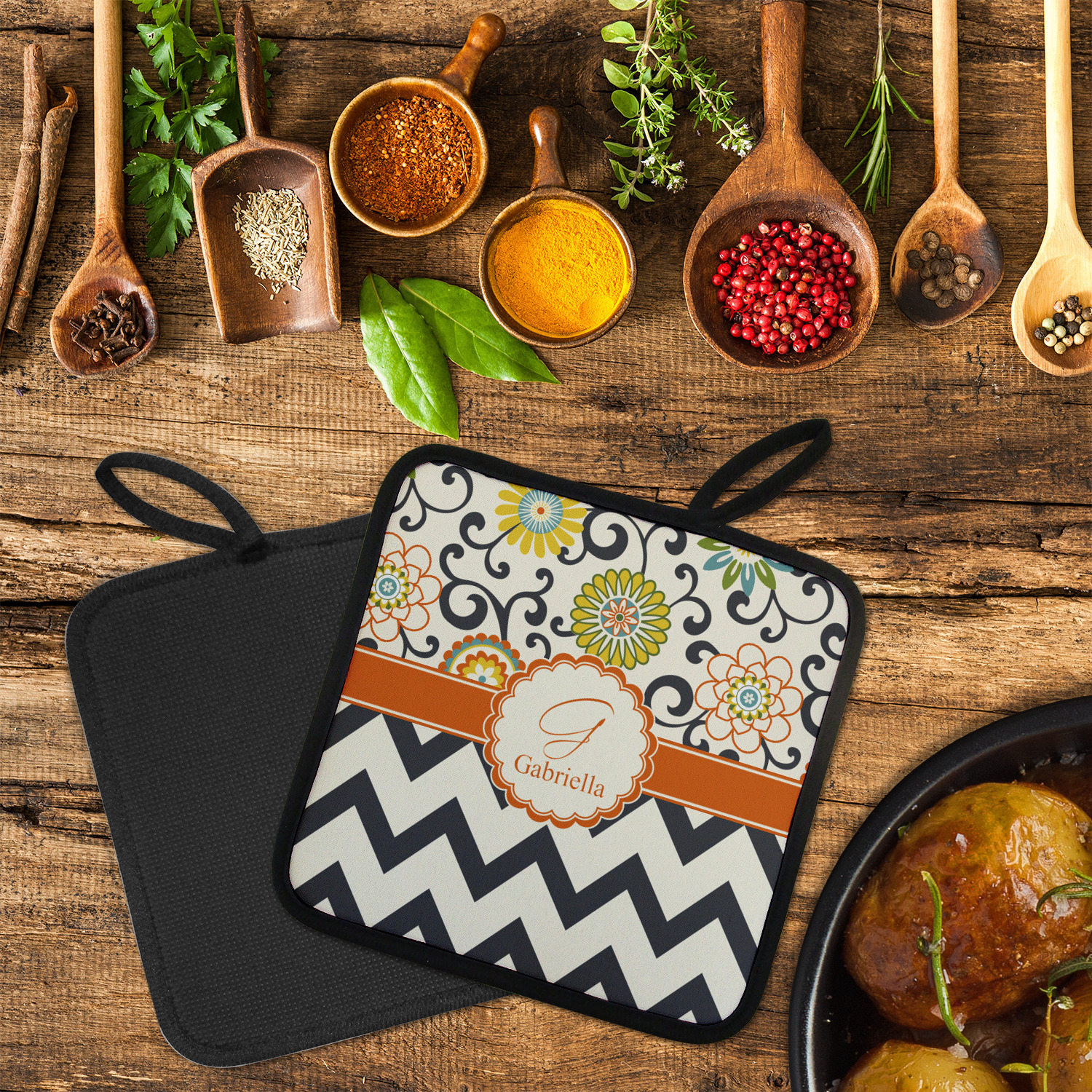 Our personalized pot holders feature a neoprene front that displays your personalization in vibrant colors. The backing of the hot pot holder is rubberized; the textured backing allows you to have a great grip when using this custom pot holder. The two materials are joined with a sleek, black trim, and the holder also includes an attached loop for hanging and storage. The pot holder is approximately 8.75 inches by 8.75 inches and 0.25 inches tall, while the fabric loop is 2.5 inches long. You can purchase a kitchen pot holder by itself or as a set of 2. We also offer a set including one pot holder and one oven mitt.