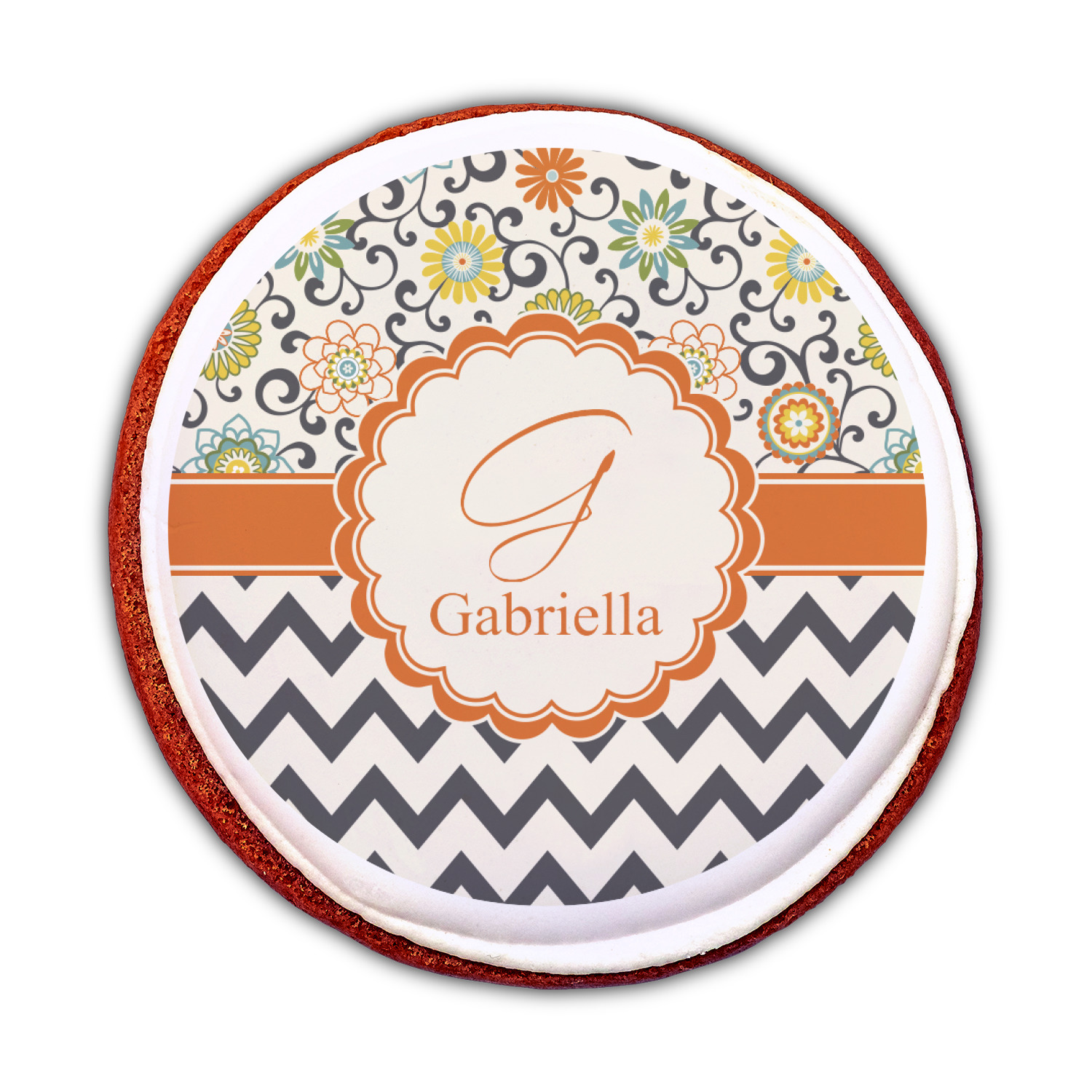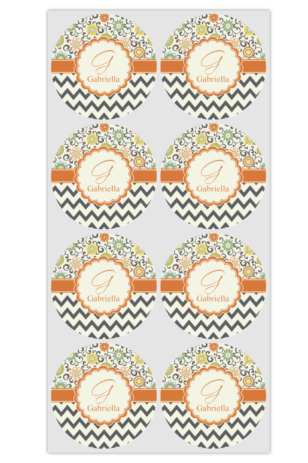 The design has a classic ribbon in orange trimmed in white. The decorative white scalloped label is trimmed in orange. Add an initial and a name for that personal touch to pull the entire design together.