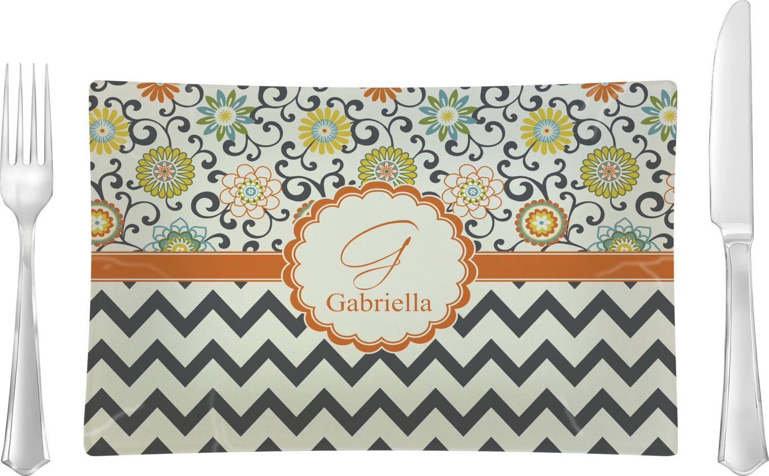 The design has a classic ribbon in orange trimmed in white. The decorative white scalloped label is trimmed in orange. Add an initial and a name for that personal touch to pull the entire design together.