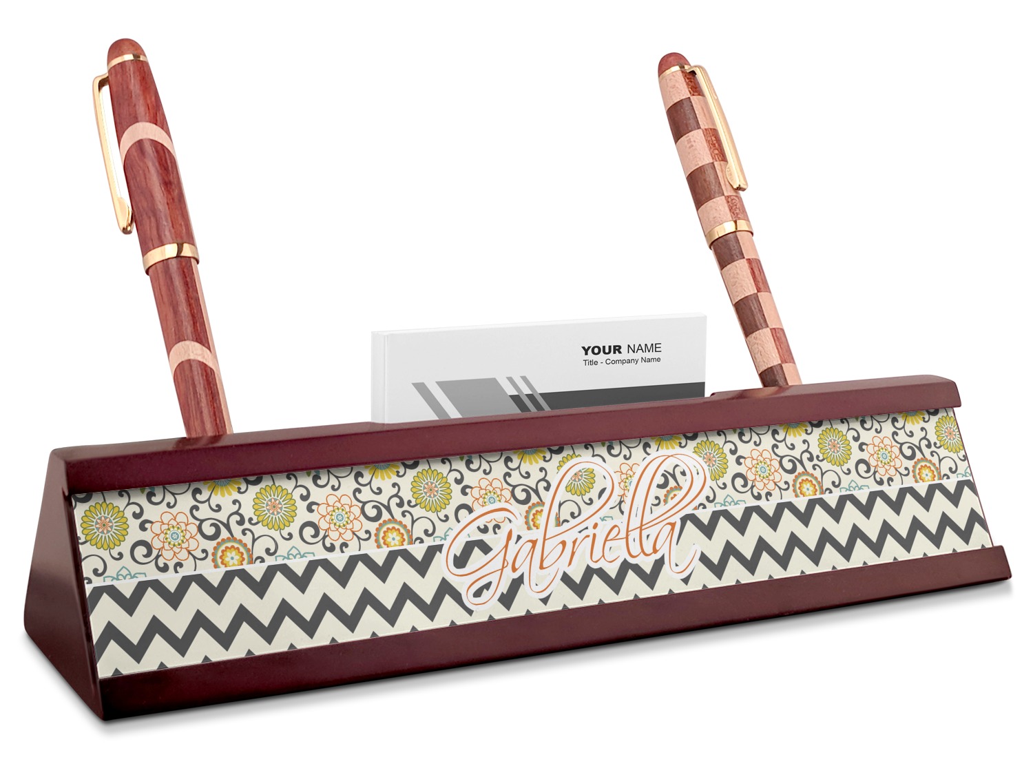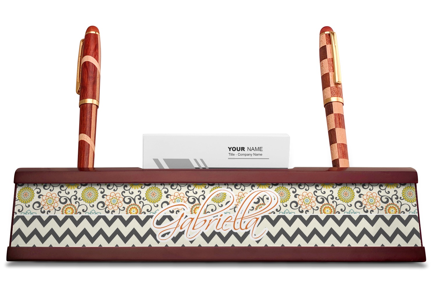 Your desk name plates are crafted from a high-quality, dark-cherry mahogany. At approximately 9.5 by 1.875 by 2.5 inches, this name plaque will fit perfectly, front and center, on your desk. Your customization spans across the entire face of the nameplate. Behind the nameplate lies a skinny slot that can fit approximately 15, traditionally-sized, business cards. You can also store your writing utensils on either side of this custom desk name plate.