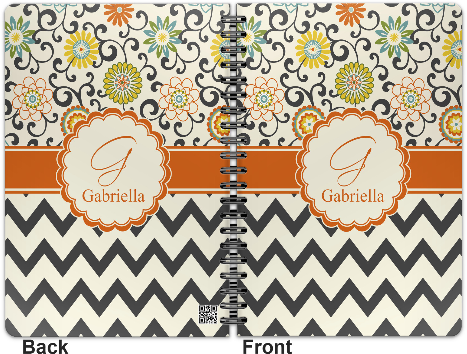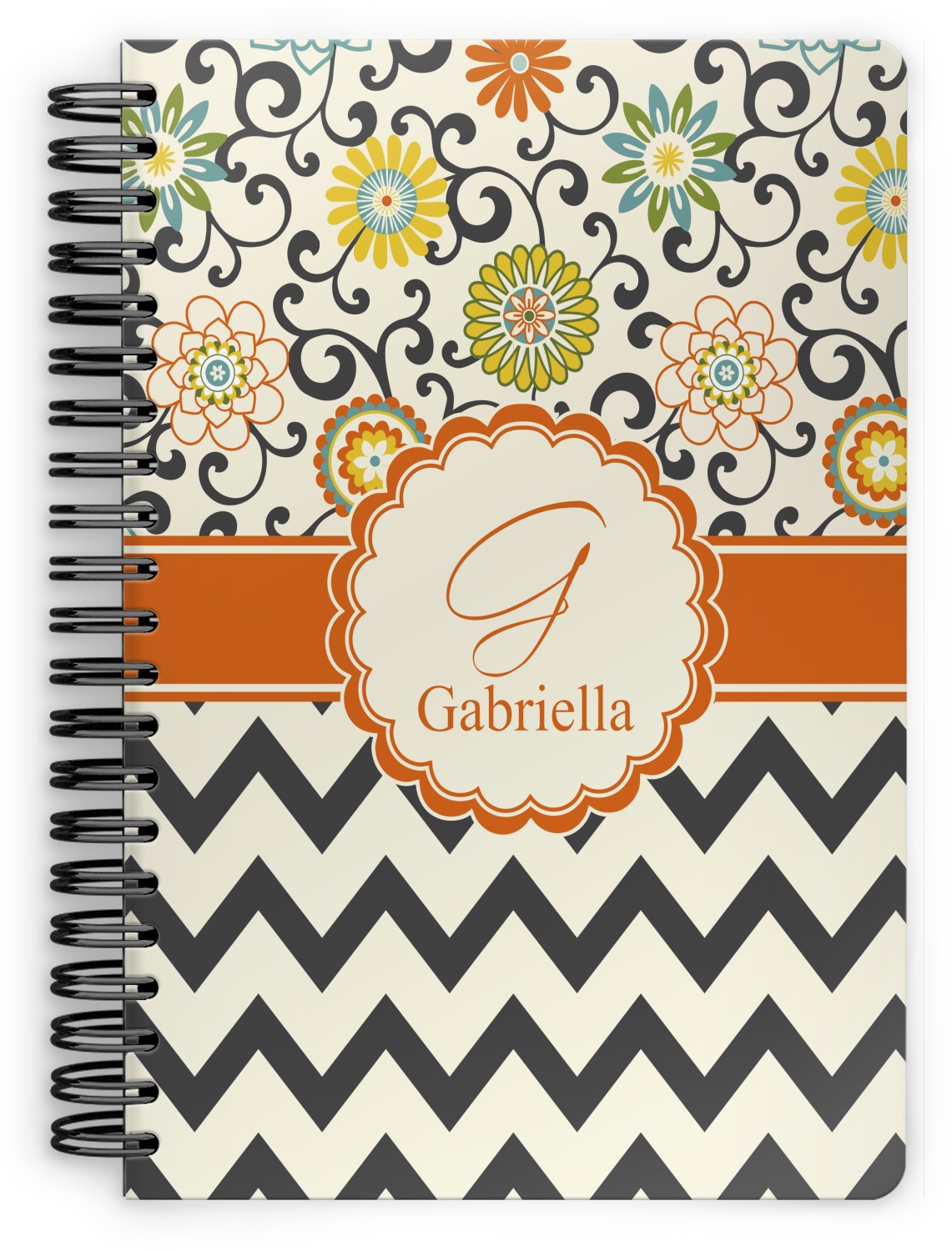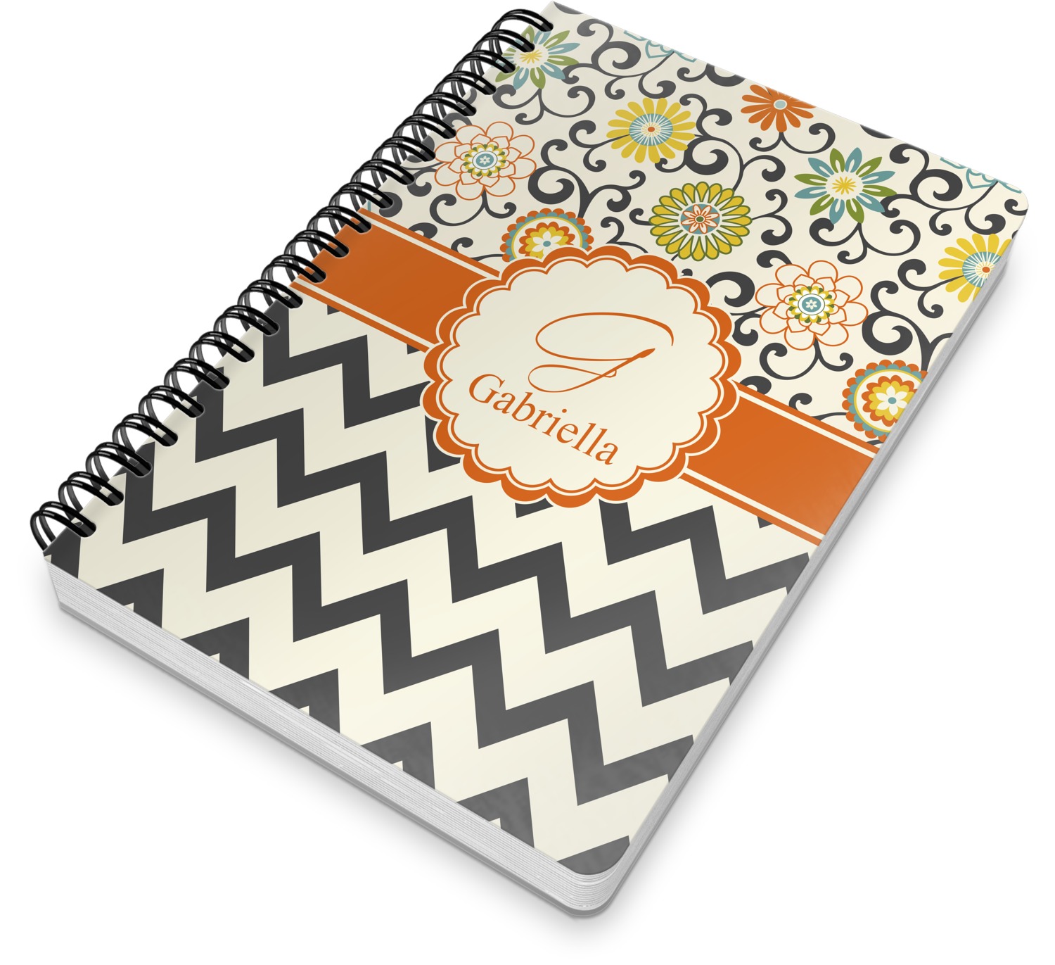 This spiral notebook includes 75 sheets of thick, ruled paper. The front and back of this custom notebook is made of a robust, laminate, plastic covering. We print your personalization on these two panels, underneath a glossy finish, which emphasizes the colors of your design. The two panels and the sheets of paper are held together by a sturdy, black coil. The paper within your bound notebook is perforated for easy, clean tearing.