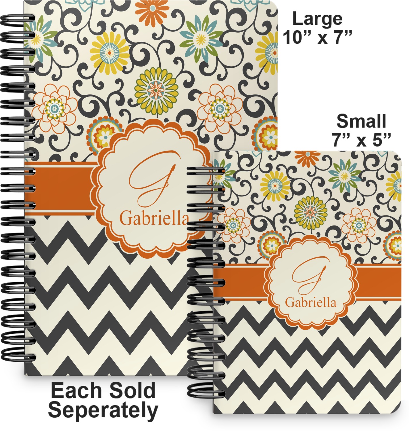 This spiral journal is available in two sizes. The first size is more suitable for a tote or purse and measures at 7" x 5". The second option is a bit larger, at 10" x 7", and is a better fit for a briefcase or backpack.