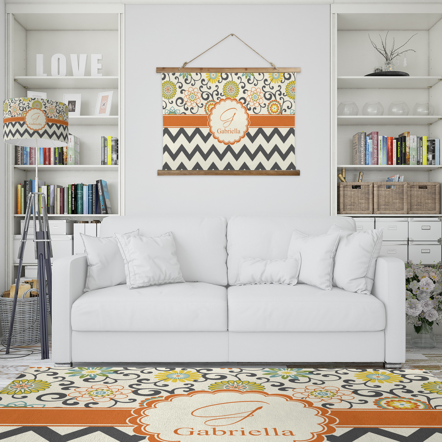 Love those 1970 retro colors but don't love the designs that come with the look? We have brought retro back to being relevant with this gorgeous swirls and floral pattern with a modern chevron pairing. The top of the design renews the orange, green, blue, and yellow but adds a modern twist by using dark gray. The floral pattern is set on a background of white to make this print come to life. The bottom of the design has the classic dark gray and white chevron print