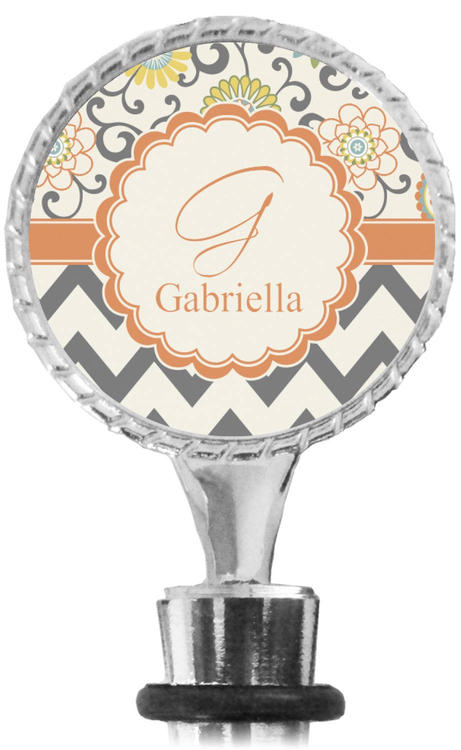 The top part of your bottle stopper is comprised of a zinc ring that displays your customization(s) in its middle, on both sides. The ring is heavy duty, with a bright chrome finish. The body of the wine stoppers have two silicone rings to provide an airtight seal. These wine bottle stoppers measure at 1.625" L x 0.8125" W x 4.625" H; your custom wine stopper is meant to fit into most standard-sized wine bottles.