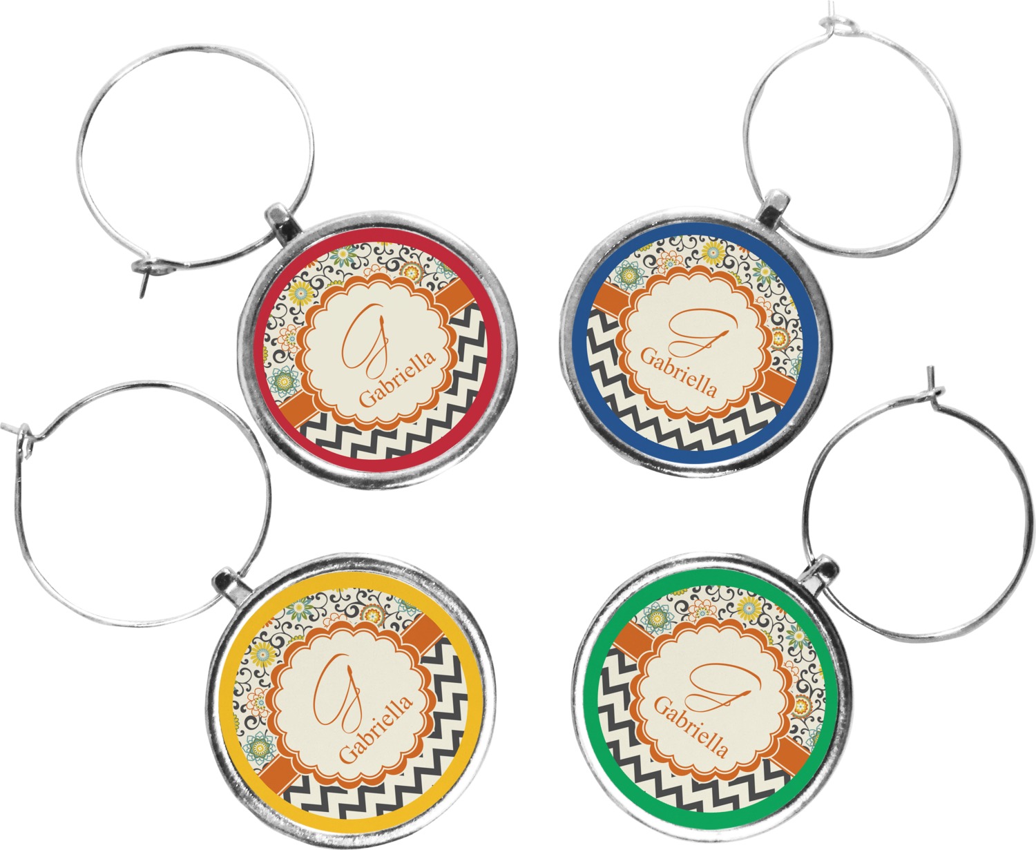 Your wine glass markers are comprised of a circular zinc plate with a 1.25 inch diameter. The zinc plate hangs from a zinc loop, which can be easily secured and removed from the stem of a wine glass. Your customized design is printed onto a 1 inch diameter insert, and then placed into the wine glass charm itself. Though sold in a set of four, you can personalize each charm individually and change the colors of the ring around your design, depending on your needs.