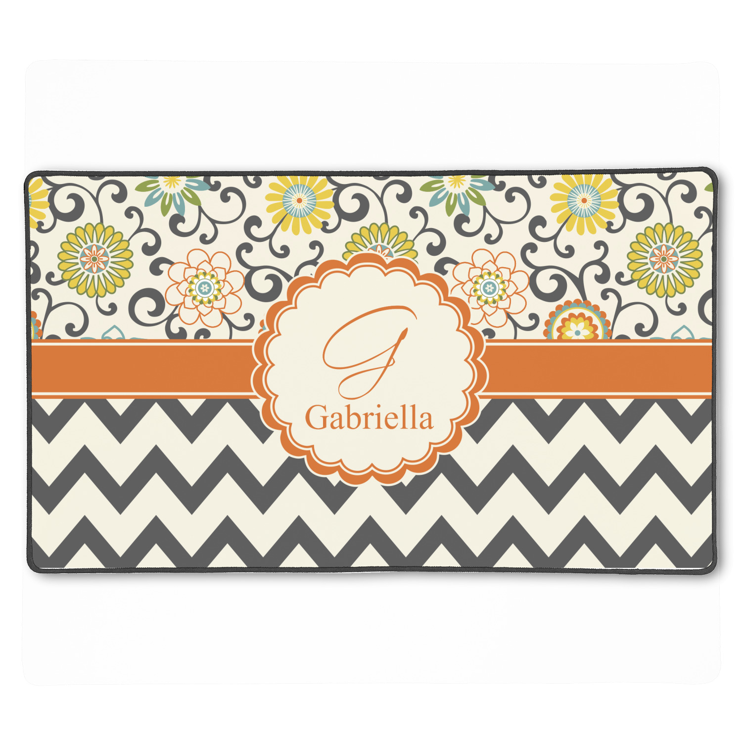 The design has a classic ribbon in orange trimmed in white. The decorative white scalloped label is trimmed in orange. Add an initial and a name for that personal touch to pull the entire design together.