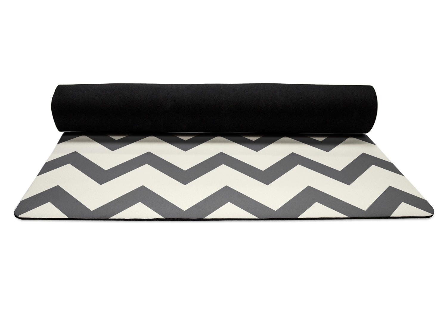 The top of the mats are dyed with your design using eco friendly non solvent inks. They have a smooth fleece felt top and feels very soft. The back of the mat is a sleek black and is a squishy non-slip texture to ensure that your mat does not slip on the floor. Our rubber backed mats are the perfect size at 68" x 24" and are just under approximately 1/4 inch thickness.